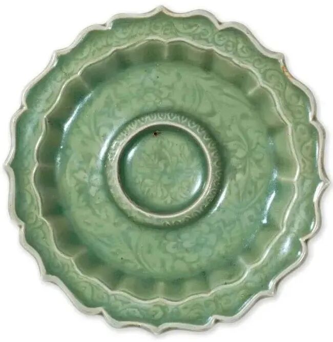 盏托一物始见于东晋,用以承托茶盏。随着饮茶文化在宋元时期的兴盛,茶盏与盏托成为固定的茶器组合,蔚为风行。此盏呈菱花口,折沿,浅腹,托中间承盏部位为堆塑一面坡式圆形托口。通体施青釉,釉色碧绿青翠,釉面温润,底部有环形无釉朱红色垫烧涩圈。折沿至盏托中心分别暗刻卷草纹、缠枝花卉纹、变形蕉叶纹及花卉纹,纹饰舒展,刻工娴熟,刀法流畅。整器秀雅端庄,古朴大方。