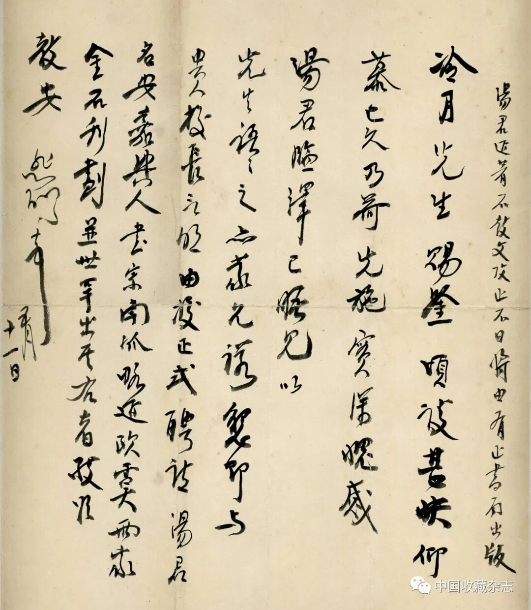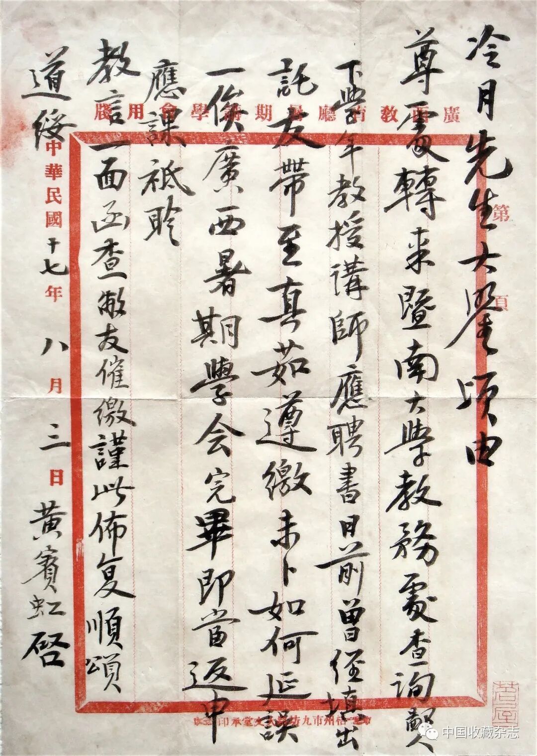 释文:冷月先生大鉴:顷由尊处转来暨南大学教务处查询鄙人下学年教授讲师应聘书,日前曾经填出托友带至真如遵缴,未卜如何延误。一俟广西暑期学会完毕,即当返申应课,祗聆教言,一面函查鄙友催缴。谨此布复,顺颂道绥!中华民国十七年八月三日,黄宾虹。(《书法导报》2006年1月11日)说明:1.8月3日,黄宾虹为暨南大学教职应聘书表格事自桂林复函谱主。2.黄宾虹(1865-1955),1928年春曾与陶冷月同游无锡梅园。1928年陶任暨南大学中国画系主任,经徐悲鸿介绍,延聘黄为中国画史教授讲师。曾为陶氏《秋山图卷》《朱熹诗意山水册》等题辞,为暨大老友邓只淳赠陶氏玉柄藤杖题刻“益友”二字。郑逸梅曾著《黄宾虹与陶冷月的友谊》一文载香港《大公报》。