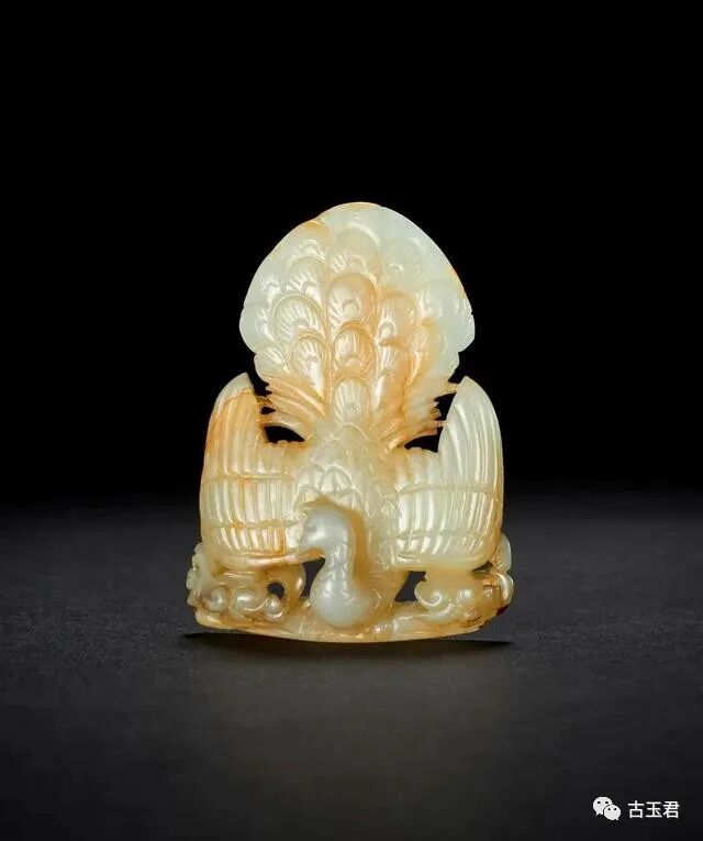 此拍品为步摇的镶嵌饰品之一,历史年代痕迹明显,选用优质的和田白玉,沁色自然。单面工艺,正面以整齐密集的阴刻线做饰,孔雀高冠竖起,尖嘴,圆眼,细颈,孔雀展翅开屏,开屏呈扇形;脚踩如意,亭亭玉立,美轮美奂。背面钻有多个牛鼻孔,此孔供镶嵌之用。整器打磨细致,工艺精湛,包浆浑厚,无论从题材还是工艺都是一件难得的精品。