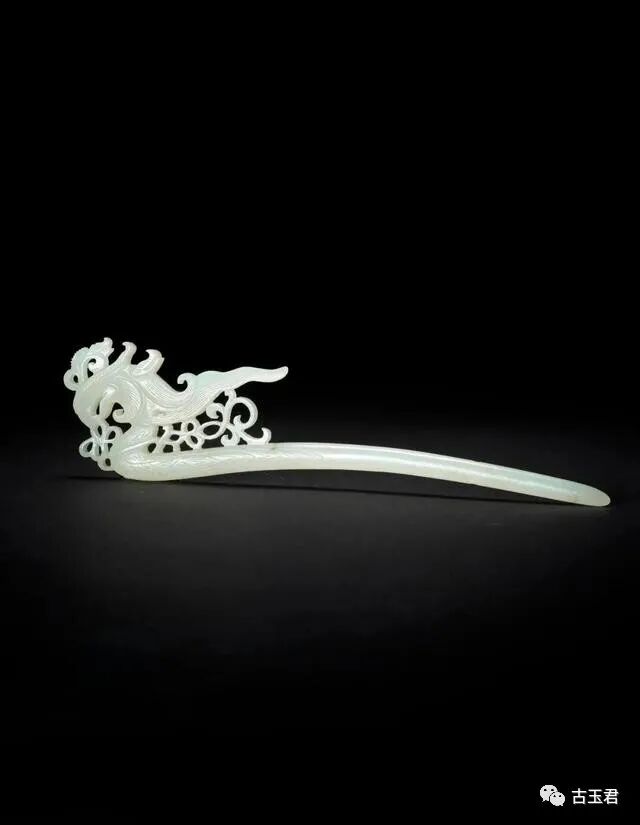 本件拍品为本次秋拍推荐的标的之一,白玉凤首簪,选材和田羊脂白玉,细腻温润。簪体修长,簪顶琢凤首,镂空雕琢,钩喙、杏眼、长翎、鬃发飘逸,细节琢刻精准到位。簪器表雕饰羽纹,刀工行云流水,十分洒脱。按其长度及雕工制式可见玉簪为典型的贵族实用器,品相完好,难能可贵。
