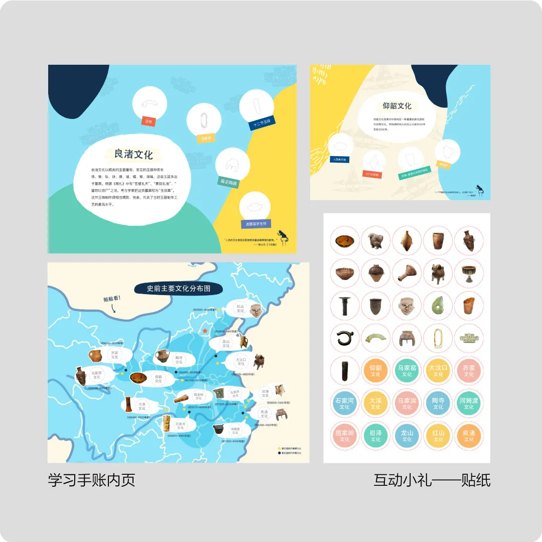 学习手账内页还将重要知识点用插画形式展示,原创文物小贴纸和互动创作可自由组合随心搭配,让孩子在游戏中记忆巩固历史大事件和重要文物,既能学又能玩。
