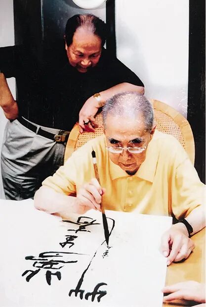▲ 原藏家郁重今与正在题写本册页的程十发合影