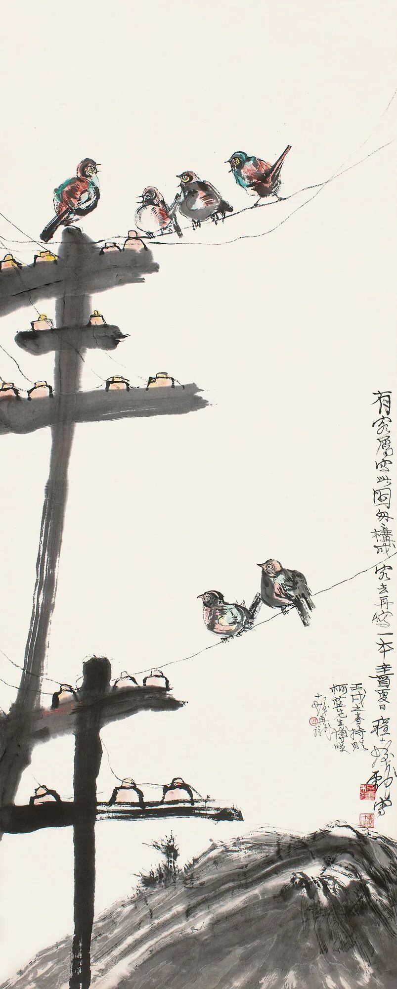 18.三峰高远翠光撒,野花山鸟自春风。甲申夏日,程十发。