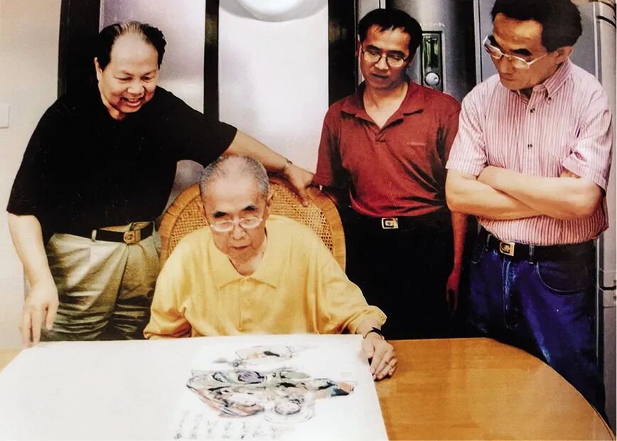 ▲ 原藏家郁重今(左一)与程十发及本册页合影