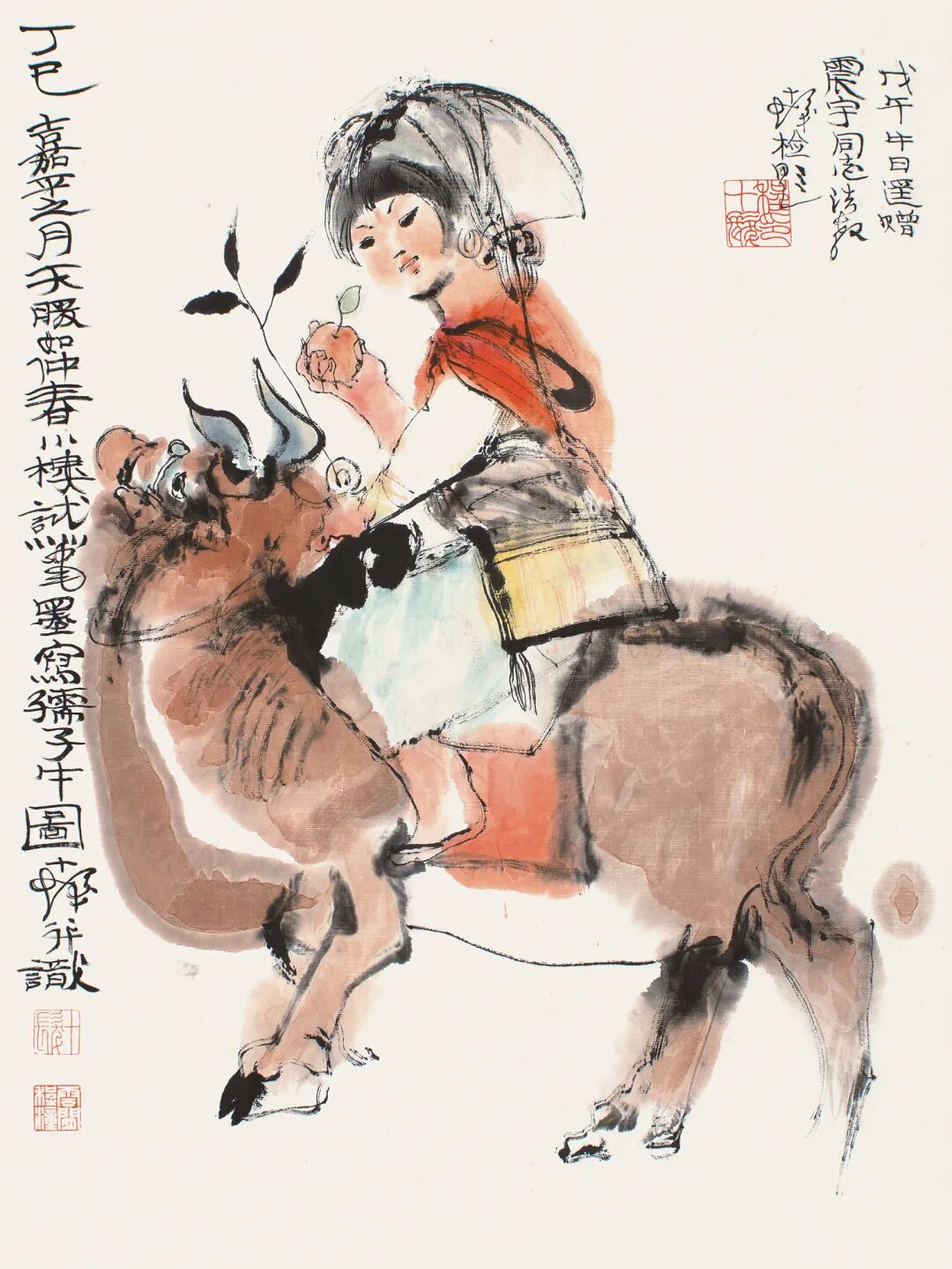 1.丁巳嘉平之月,天暖如仲春,小楼试笔墨写孺子牛图,十发并识。