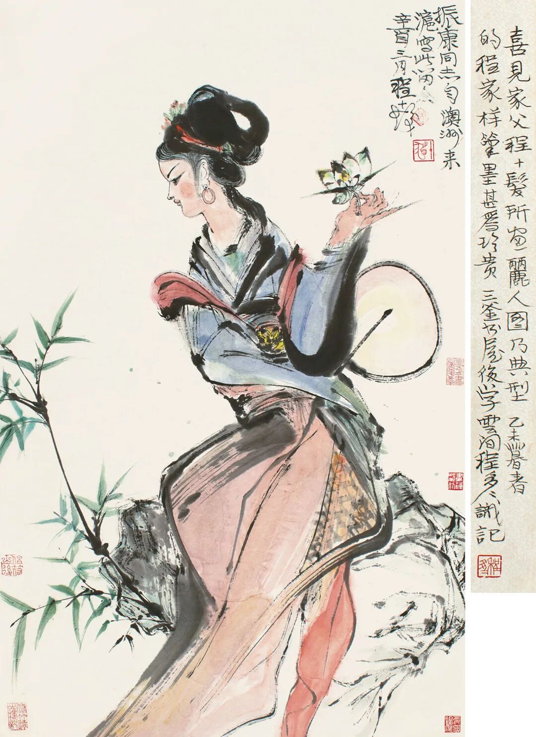 边跋:喜见家父程十发所画丽人图,乃典型的程家样笔墨,甚为珍贵。乙未暮春,三釜书屋后学云间程多多识记。钤印:程多多、三釜书屋后学、多多鉴定