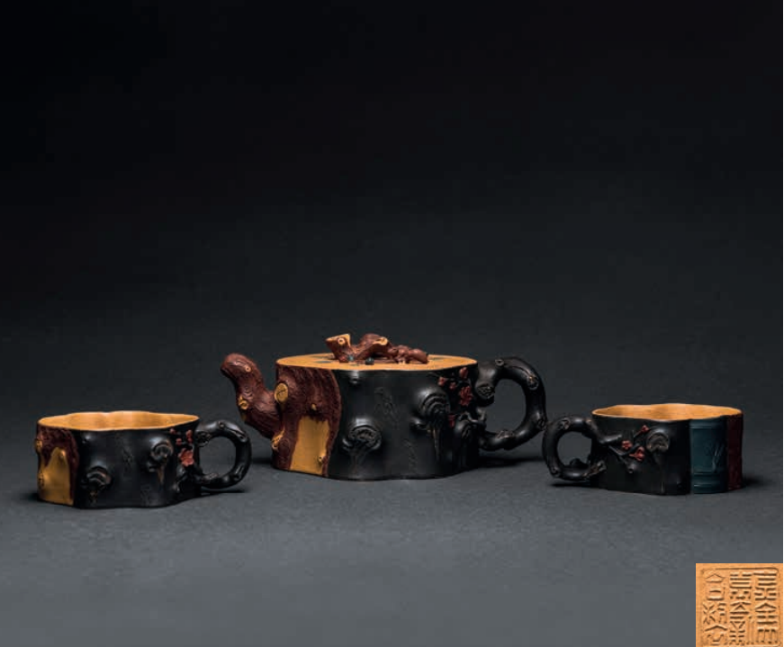 在中华传统文化中,文人雅士为借物抒情、拟物寄志,常将在冰雪季节仍保持独立精神的“松、竹、梅”喻为品格高雅的“岁寒三友”。紫砂壶艺创作中,也多有取自然界中松竹梅形态为题材的作品问世。这件作品就是以仿自然的艺术手段构思创意,并通过鲜活生动的形态塑造,以寄托一种对坚韧不拔精神的追求与向往。该作品将自然界中的松竹梅素材进行综合提练,运用紫砂花塑器传统的捏塑、雕镂、堆贴等工艺技法进行制作,并在继承传统的基础上有所创新。整器色泽靓丽,形态特征鲜明,嘴、把、钮等附体与壶身主体相互呼应,其自然古朴、生机盎然的逼真形态与高洁风貌,进一步衬托出三友的趣味相投与情深意长,具有深厚的自然生活情趣与浓郁的传统文化气息。