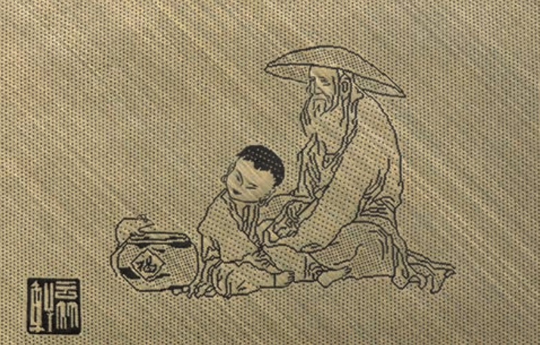 十二生肖之首的老鼠,象征机灵,生命力强。此副作品是程丽在众多竹子中挑选竹节比较长的慈竹,选竹节在80厘米左右无疤痕的一年青壮竹,经过锯节,劈蔑等数十道工序,把竹子劈成薄如蝉翼细如发的竹丝,再经过挑压拼等工艺历经2个月编织而成。作品中童子倚坐在老翁膝前,双双屏息凝神,将目光投向旁边的福盆,一只老鼠正趴在福盆边缘警惕地张望。一静一动,极富情趣。该作品采用喜闻乐见的传统题材,寓意老有福寿,少有嘉康,一派天伦之乐。