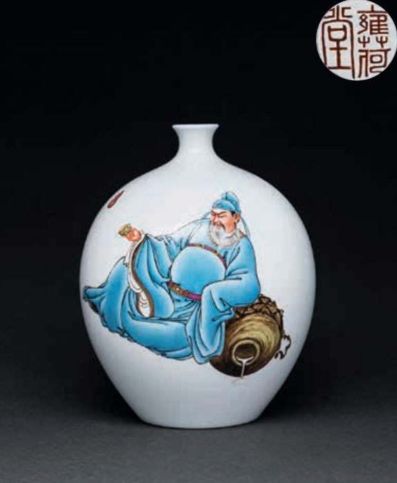 瓶上粉彩绘就唐代执杯雅士一名:醉倚酒尊,右手执杯,沉吟思索,若有所得,以致玉杯倾斜,琼浆洒落,而浑然不知。此种忘我之境,明眼人一眼便知,正是“诗仙”李太白于花萼相辉楼中,似醉非醉、半梦半醒之间为杨贵妃吟出“云想衣裳花想容,春风拂槛露华浓。”神句的瞬间。那是大唐的高光时刻,也是李白的高光时刻,更是诗与酒的高光时刻。而这一刻又被作者以高超的技艺定格在了这件粉彩瓷器上。作品用笔遒劲,以高古游丝描技法勾勒线条,中锋用笔,朴拙、厚实、圆润。画面绚丽照人,光彩艳发。多层次的渲染,使画面的明暗层次和冷暖变化丰富,有传统工笔重彩的艺术效果。人物脸部刻画细腻,讲究明暗变化,有西画中的素描关系和光影变化,晕染手法独特,立体感强。
