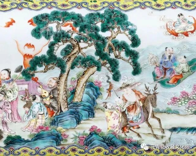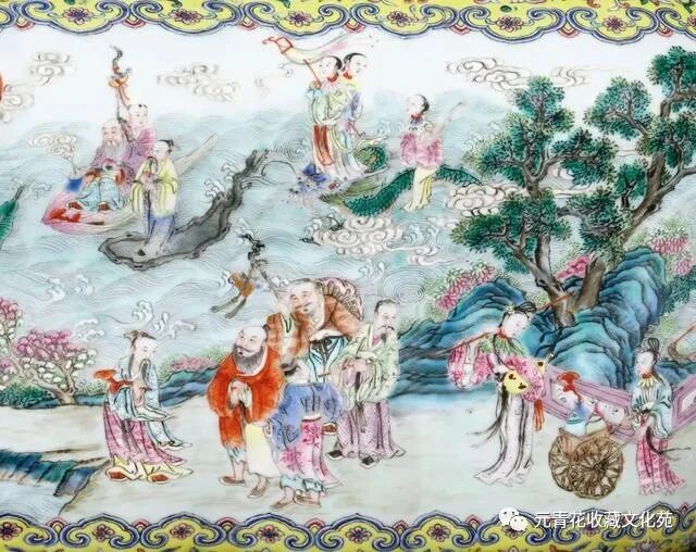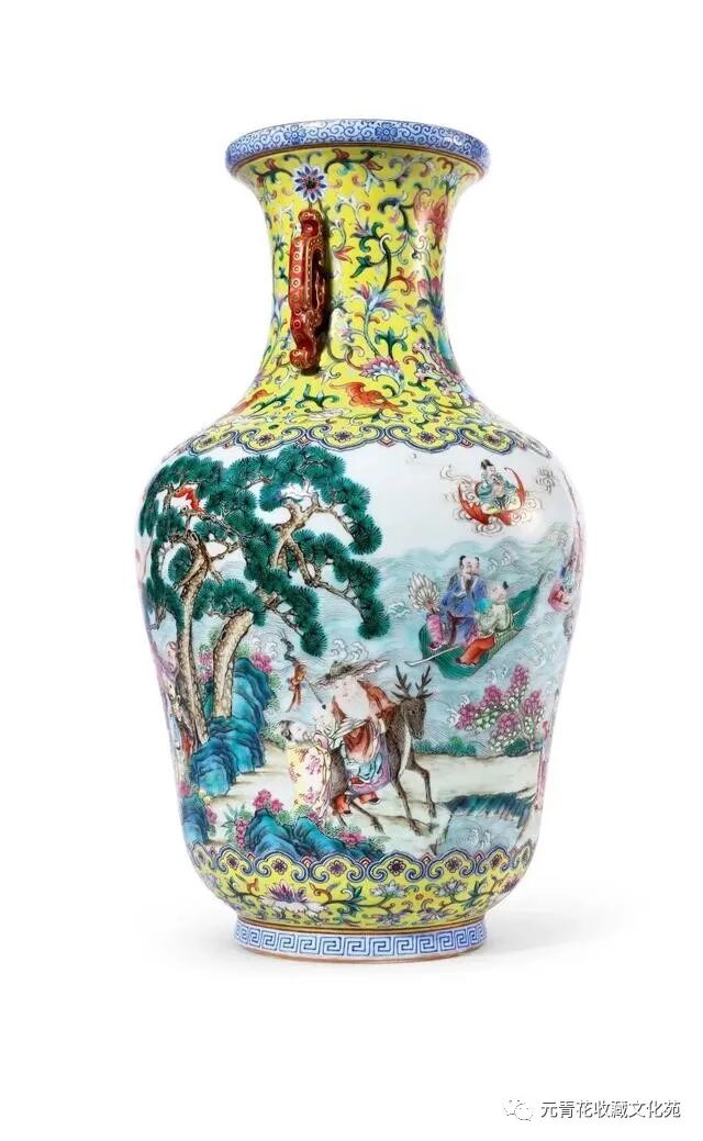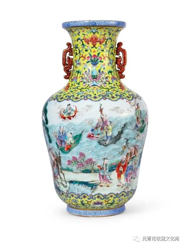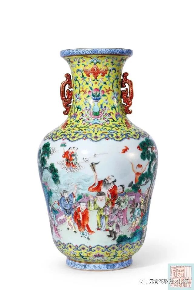 拍品颈部饰珊瑚红地描金螭龙耳,造型端庄沉稳,里施松石绿釉,口沿及圈足蓝料绘卷草团花纹及回纹,边缘描金,瓶身颈部及近足处以黄彩为地,上绘缠枝莲托福寿纹,下绘缠枝花卉纹,寓意『福寿吉庆』。腹部通景白釉为地,以粉彩绘群仙祝寿图,构图布局上下呼应, 错落有致。人物多达二十余人,众位神仙神态各异,栩栩如生。描绘精细,形象逼真,设色丰富淡雅,线条自然流畅,富有强烈的立体感。除了为宫廷陈设外,还有祝愿万寿之意。拍品上下纹饰及用彩形成了强烈的对比,上半部分尽显宫廷雍容华贵,下半部分意指蓬莱仙境, 整器气势宏伟构图疏密有致,远近相映,施彩丰富,纹饰繁缛细腻,寓意吉祥,尽展乾隆晚期嘉庆早期瓷器奢华的艺术遗风。
