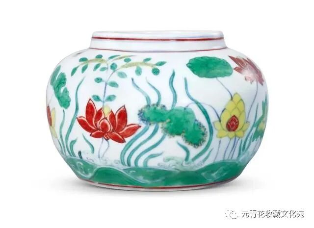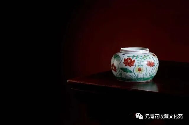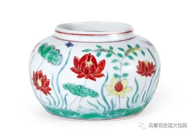 拍品成化斗彩荷莲纹罐,胎体薄厚适中,施彩主要由红彩和绿彩构成,釉下青花画工精湛,红彩凝腻深厚,绿彩清凉如水,构成一幅夏日荷塘胜景,传世者未见他者,仅见此例。