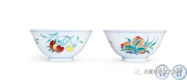 拍品隽雅端秀,小巧精致,成对流传,实属罕见。通体施白釉,外壁以斗彩绘折枝黄里透红的寿桃、娇黄的佛手及黄红相映的荔枝,在枝叶的衬托下摇曳生姿。杯心绘折枝蔷薇,红花富贵绮丽,绿叶清新自然。整器画片寓意吉祥,色彩柔和典雅,相配殊妙。底双圈内书「大清雍正年制」楷书款。为雍正仿古逸品。
