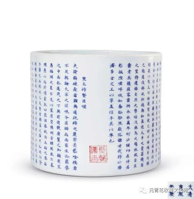 《圣主得贤臣颂》是汉代蜀人王褒应汉宣帝之昭,书写圣主与贤臣之间的关系。以此为笔筒文饰,装点书房,也是迎合清朝统治者所褒扬的价值观念,康熙呈帝为稳定其统位,大兴文治,打破满汉之分,合民族裂痕,特提拔各种人才为国家所用,体现了他对贤臣的渴求。康熙皇帝在《制砚说》写道:“朕御极以来,恒念山林蔽泽,必有隐伏沉沦之士,屡诏征求,多方甄录,用期野无遗佚,庶惬爱育人才之意。”《圣主得贤臣颂》从这种君臣关系入手,鼓舞士人实现青云之志,报效国家。其前后各朝瓷器上均无此种作品,具有异常鲜明的时代特性。