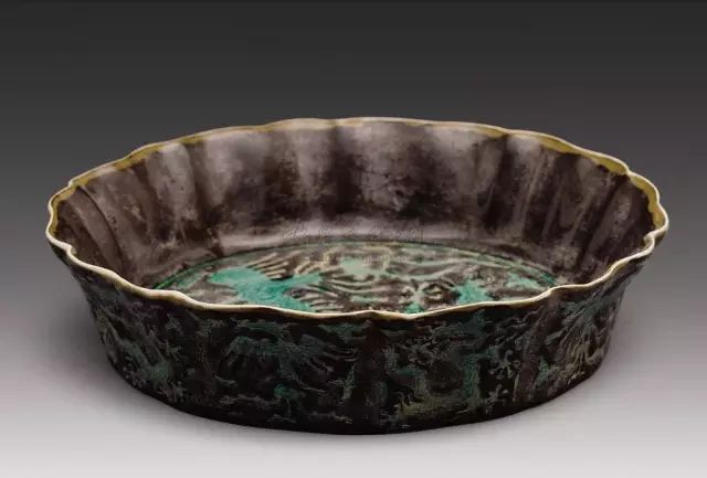 酱釉:又称“紫金釉”,为宣德仿宋代紫定的制品,色分深浅,有桔皮纹,多见水仙盆等物。清代康、雍多仿制,宣德时制品与康、雍时的仿品最大区别在于,通过釉面磨损的地方可以看见,宣德酱釉下面有层黑釉,而康、雍时的仿品则没有。