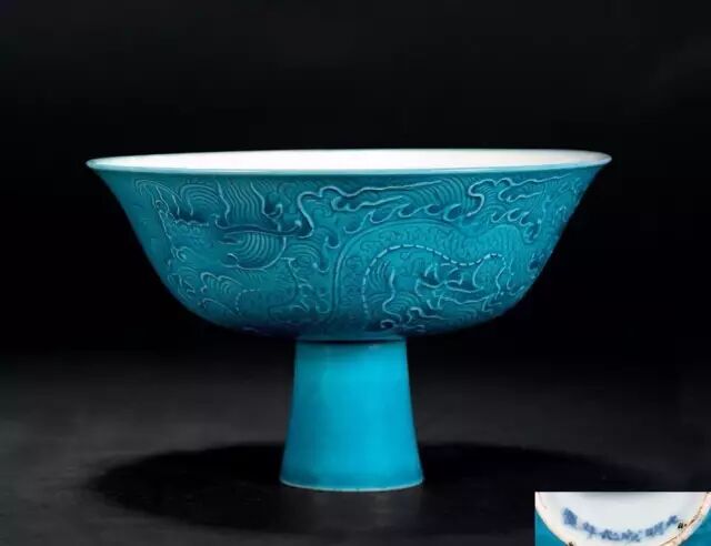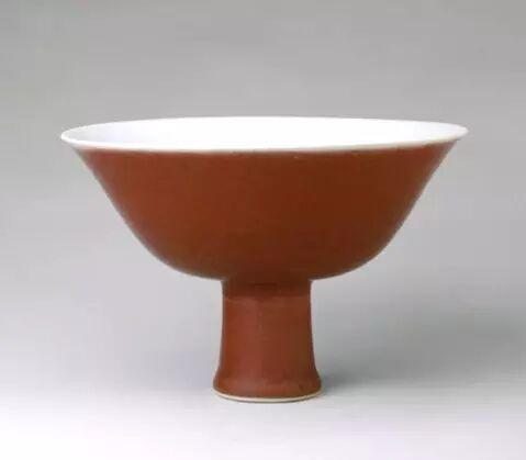 永乐时期的红釉暗花高足碗,是这一时期的代表作品,故宫传世品中仅有2件,为稀世珍品。1件通体施满红釉,胎体轻薄,无纹饰;另 1件碗外壁施满鲜红釉,里部施白釉划刻云龙纹饰,碗心刻一葵花,在花心内刻篆书“永乐年制”款识。