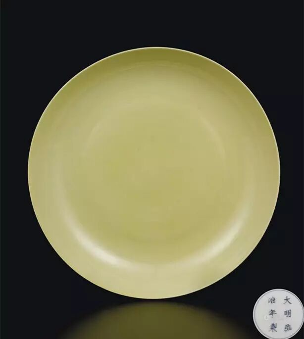 自明初至明末万历年间,未停止生产过,到弘治时,低温黄釉的生产达到了历史最高水平,弘治黄釉较宣德、成化颜色要鲜亮,且深不少,较之正德黄釉,则又淡一些,属于深浅适中。此时的黄釉多施于盘、碗上,圈足较宣德、成化时期明显变矮,并且向底内收,胎釉交汇处往往有一丝较为浅淡的火石红,另外盘碗之底釉多呈现如湖水绿色般的青灰色。