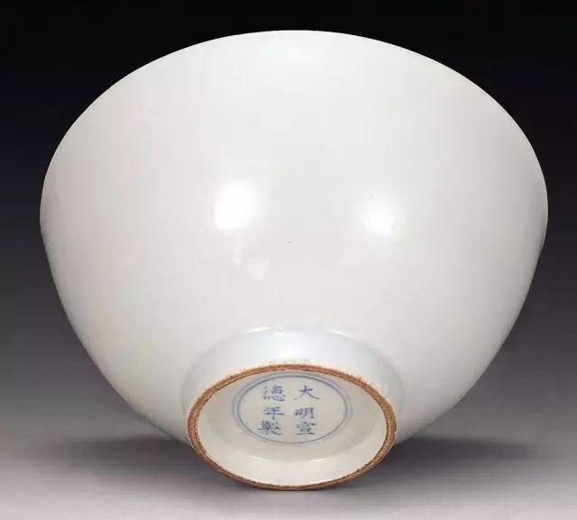 白釉:宣德时期的白釉瓷器较之永乐朝的甜白釉瓷器,两者之间的区别还是比较明显的,不像永乐朝与宣德朝的青花瓷器十分相近,一直有“永宣”不分之说。宣德时期的白瓷,多是宫廷祭祀或是饮食器物,鉴定其是否有鲜明的朝代特征,如有无密集的小桔皮棕眼,即“桔皮纹”,如有则为宣德器物,另外此时白釉多署本朝暗刻款。