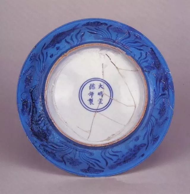 蓝釉:多见于碗、盘上,另有尊、爵器皿,此时的蓝釉较成化时期肥厚程度有过之而无不及,无桔皮纹,蓝中泛黑的程度较成化时更重,往往一眼看去黑色的比重大于蓝色。另外盘碗的圈足较之前朝,也相应缩短,向底心内收,仍不时有凹陷的现象。