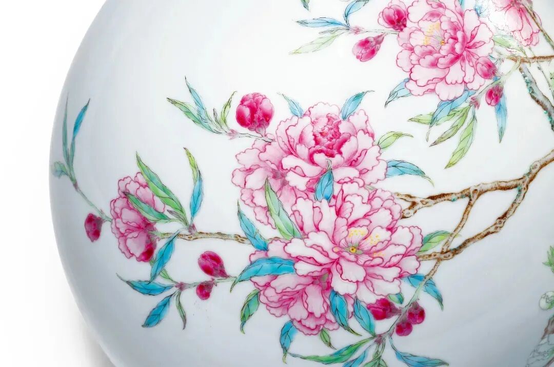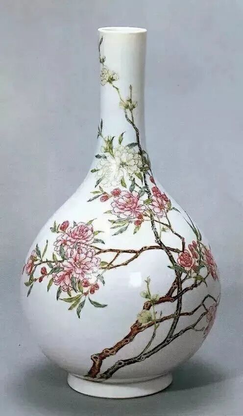 我们先来欣赏一件清雍正御制瓷胎洋彩珐琅 「春风碧桃图」胆瓶,是深刻体现胤禛摹古情结的一件杰出佳例。