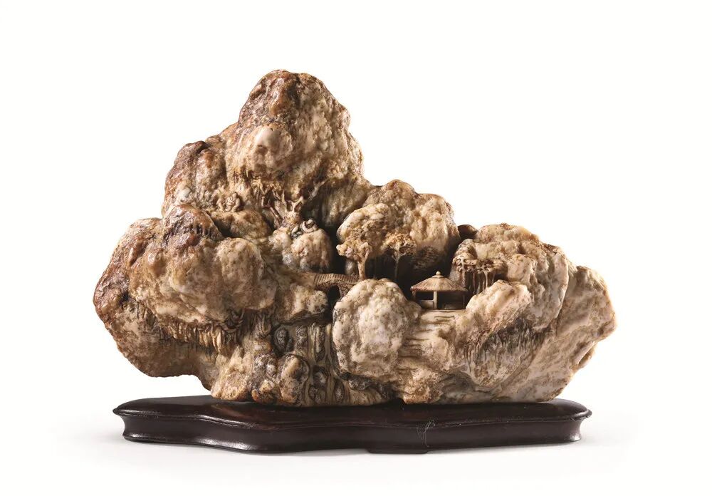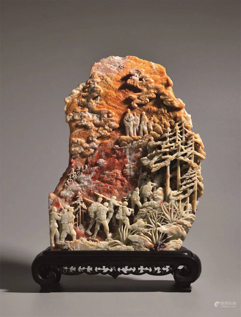 Lot 913 清早期 汪洙风格浮雕山居图芙蓉石山子拍品估价:3,000,000 - 4,000,000 人民币山子以整块寿山芙蓉石为材,石质润泽可人。刻者巧借石色,因形取势,用浮雕、镂雕、线刻等技法,在原石上凿刻出林屋小筑。见有重山奇石、修竹翠木,小溪瀑布川流其间,有亭桥村屋错落于林壑之中。山子正反两面皆满刻山景,雕琢细腻入微,察其局部,可见旅者歇憩于林中,高士徜徉于树下,乃至山底溪畔猿猴嬉戏、茅屋窗内案几书卷,皆细刻而出,精妙已极。整件山子远近层次分明,景致细节丰富,赏之尤觉意趣不尽。山子一侧留白处,刻『山水有清音』,落『友三』款。