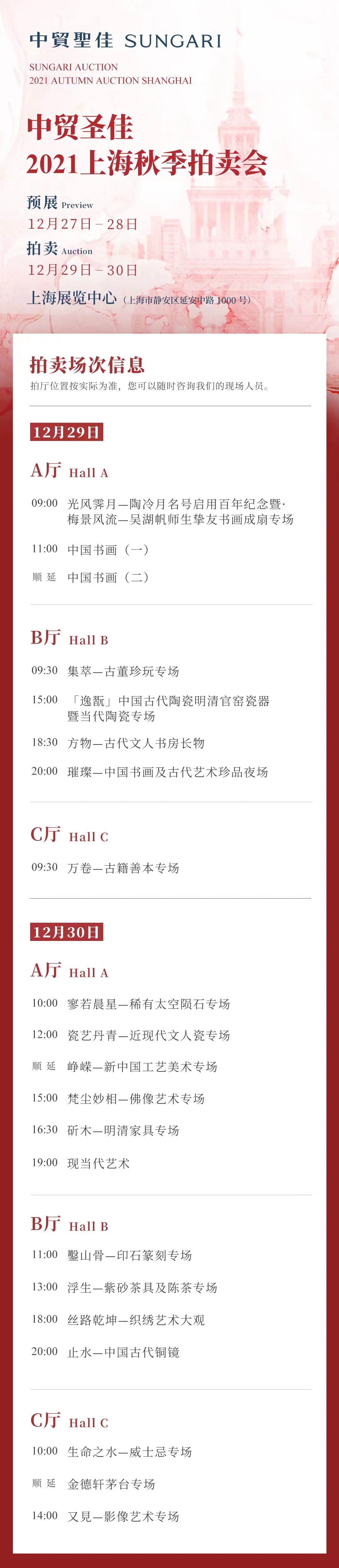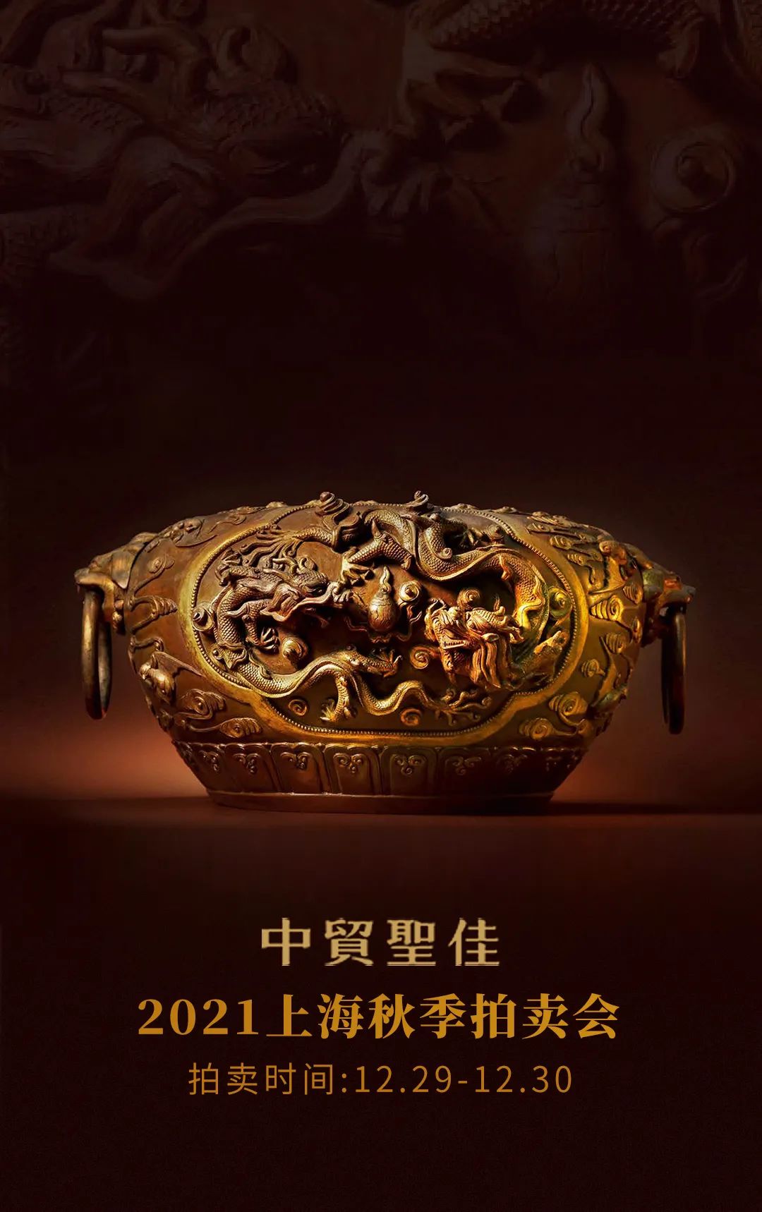 12月27日,中贸圣佳『2021上海秋季拍卖会』将在上海展览中心隆重拉开帷幕,12月27-28日举行预展,各大专场将于29-30日陆续举槌。本次拍卖共甄选3000余件精品佳作,21个专场将涵盖古董珍玩、书画古籍、文房杂项、美酒佳酿、佛像艺术、明清家具、现当代艺术等,门类齐全,珍品荟萃。本次的「璀璨——中国书画及古代艺术珍品夜场」共呈现传承有序的83件宫廷佳器与名家翰墨。其中不乏茧山龙泉堂、芝加哥艺术博物馆等著名收藏团队之旧藏,亦有经张宗宪、大英博物馆中国艺术部主任 Soame Jenyns 先生等知名收藏家传递之珍品。