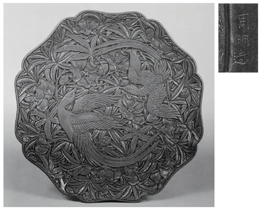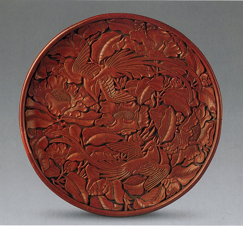 整器花叶布满,不刻锦地,表现出较明显的元代剔红制品的风格,可以参阅清宫旧藏元代剔红茶花绶带图圆盘,为清宫旧藏,见《故宫博物院藏文物珍品大系-元明漆器》,页13,图7。另日本德川美术馆、根津美术馆编着的《雕漆》中,着录一件剔红秋葵锦鸡纹盘,底部署『周明造』针划款,应为元代著名漆工周明所作。彼件作品,花枝锦簇、锦鸡翩飞之仪态与本品如出一辙,应属艺出同工之作,是本品时代、工艺之有力佐证。