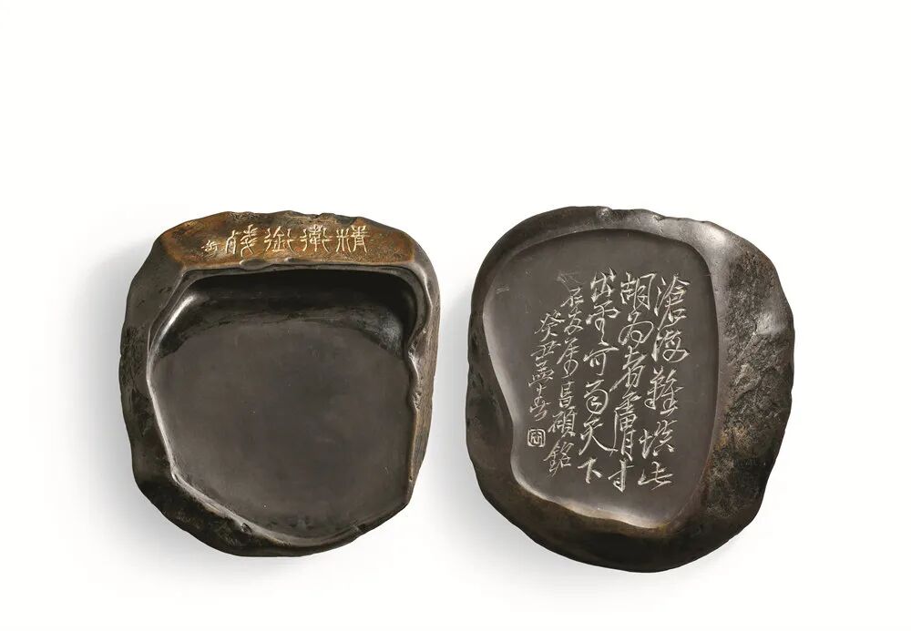 Lot 2417 清 《沈氏砚林》著录 吴昌硕铭 沈石友藏精卫衔残砚拍品估价:2,200,000 - 2,600,000 人民币2、沧海难填,此胡为者,肤寸出云,可雨天下。石友属昌硕铭。癸丑孟春。【印文】缶。论晚清名砚,则言必及沈石友与《沈氏砚林》。沈汝瑾,字公周,因喜石砚而号石友,别署钝居士,江苏常熟人。石友工诗善书,精篆刻,富收藏,尤嗜砚石,晚年藏砚百数十方,自号“百石老人”。其每有所获,便邀吴昌硕共作题、画,由吴昌硕弟子赵古泥(1874-1933)镌刻于砚上,尤得文人雅趣。此砚为端州水坑石制成,石质妙绝,其色深紫,抚之温润细密,有散墨不凝之质。制砚者惜其石质,仅略斫成形,四侧留青皮,唯上、下两面精心修磨,成砚堂、覆手。砚首深挖墨池,上方留皮处不施打磨,天然作斜削状,形如斧劈,可谓鬼斧神工。砚首、覆手两处刻铭,一为砚名“精卫衔残”;一为题刻:“沧海难填,此胡为者。肤寸出云,可雨天下。石友属昌硕铭。癸丑孟春。”配红木砚盒,上存「白沙邨庄」印款。砚以“精卫衔残”自铭,又言“沧海难填,此胡为者”,甚有雄浑悲怆之感,《沈氏砚林》中的砚铭多颂砚、抒情者,此方精卫衔残砚在其中颇显特别。“精卫衔残”不仅是此方砚石的气质,也是缶翁半生坎坷仕途的写照。
