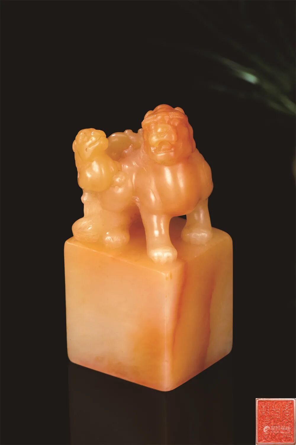 清代早期的田黄印章以方章为最上品,其中尤以宫廷御供的作品最为典正,多方正平台,选料精到,工艺精湛,成此佳品,可谓天时地利人和缺一不可。如本件拍品,无论制形、气息、工艺皆大类清三代宫廷典藏寿山石玺印,乃至钮式于府库旧藏几无二致。整件田黄太狮少狮钮方章,通体呈枇杷黄,色泽纯正,冻透润泽,章体上萝卜丝纹历历可见,纹理丰富细腻,质地温润无暇、细腻凝润。雕钮作扭身侧首的卧狮,双目圆睁,张口露齿,神态威严中透著和煦。幼狮攀爬戏耍,顽皮可爱,刻画饱满流畅而纤毫毕现,古雅凝重,刻工精炼,精细传神,自然生动,也可谓美石良工,相得益彰。