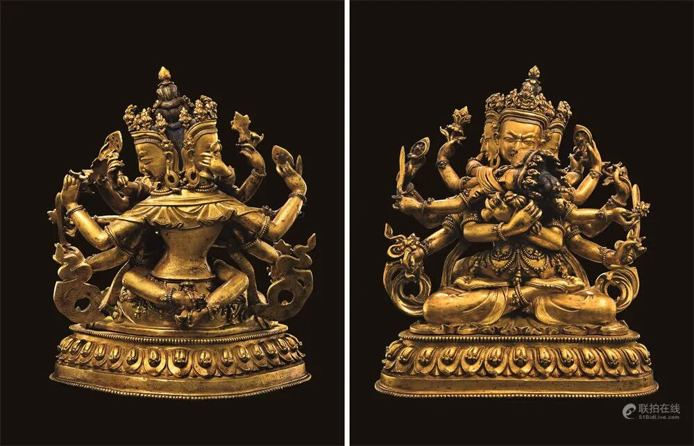 Lot 1829 17世纪 西藏扎什仑布寺 密集金刚像拍品估价:3,800,000 - 4,000,000 人民币来源:美国知名收藏家 Doris Wiener 旧藏藏家介绍:Doris Wiener(1922-2011),美国知名收藏家,于上世纪六十年代成立了独立的艺术画廊,致力于印度、喜马拉雅及东南亚艺术的经纪,成为受到各大博物馆及诸如“泛亚收藏”等公私机构信任的专业人员,经她之手纳入机构收藏的作品可谓件件精美罕见。此像为三头六臂双身形象。三头成排而列,分居中左右三个方位,分别象征怀爱、息灾和伏魔三种功德。三头皆戴五花冠,头顶共束一塔状高发髻,双耳上下佩戴耳花和圆形大耳环。面形饱满方正,五官刻画清晰生动,双眉紧锁,张口龇牙,表情半怒半静,完全依循尊像的仪轨而来。全身结构匀称,躯体、手臂及双腿造型规范,姿态舒展自如。上身饰璎珞,下身着僧裙,腰间束宝带,腰带下亦缀以连珠式璎珞,双肩披帔帛,手足戴钏镯。衣纹写实自然,身躯及小腿部可见的翻卷飘动的衣褶,质感颇为强烈。结跏趺端坐于双层束腰莲花宝座上,六手各持法器或结印契。中二手以交叉形式结金刚·迦罗印并抱明妃,左右手分别持金刚铃杵,象征慈悲与智慧双成,其余右上手持法轮,右下手持宝珠,左上手持莲花,左下手持宝剑。六手的持物涵盖了密教五部的象征物,如金刚铃杵代表东方金刚部,宝珠代表南方宝部,莲花代表西方莲花部,宝剑代表北方业部,法轮代表中央佛部,标明此尊具有统摄密教五部的地位和功用。其明妃称“金刚可触母”,亦为三面六臂形象,其头冠、配饰、持物,乃至一切细微处与主尊特征完全一致。整体造型完美,法相庄严,工艺精湛,品相完好之极,堪称一尊难得的古代藏传金铜造像精品。