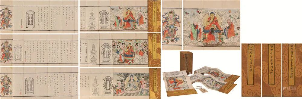 拍品估价:300,000 - 500,000 人民币此经一函三册,如意云纹函套,宫廷装帧,华贵雍容。经原为董诰手写以成,后经宫廷画家沈贞于每册经首尾手绘扉画,重新装裱以成。董诰、沈贞两位清代名士合璧,更显华贵。书中夹有民国时期国立北平故宫博物院清点标签,记作“律八一四136”,清宫旧藏无疑。沈贞,道光至光绪时期宫廷画家,以擅绘人物、花鸟供奉于晚清如意馆。其画风用笔工细精整,设色艳丽华贵,深得宫廷绘画之审美意趣。