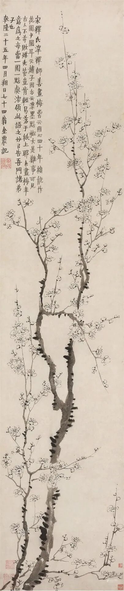 拍品估价:3,800,000 - 4,500,000 人民币题识:宋释氏泽禅师善画梅,尝云用心四十年才能作花圈少圆耳。元赵子固亦云浓墨点椒大是难事。可见古人不苟败煤秃管,岂肯轻易落于纸上耶余画梅率意为之,每当一圈点处,深领此语之妙,以告吾门诸弟子也。乾隆二十五年四月朔日七十四翁金农记。鉴藏印:祖颐(白)、心吉庐(朱)、南通吴氏收藏书画记(朱)、思学斋(朱)1.《国泰美术馆选集》第一辑,第37页,1977年。2.《中国绘画总合图录》第二卷,第11-32,东京大学出版社,1982年。3.《金农书画集》上册,图版234,人民美术出版社,1998年。2.《扬州八怪现存画目》第268页,江苏美术出版社,1991年。3.《扬州八怪书画年表》第272页,江苏美术出版社,1992年。4.《小残卷斋藏珍本·冬心先生集七种》第469页,国家图书馆出版社,2020年。说明:清代收藏家潘祖颐、近代著名藏家吴普心旧藏,近代台湾著名收藏家蔡辰男国泰美术馆旧藏。