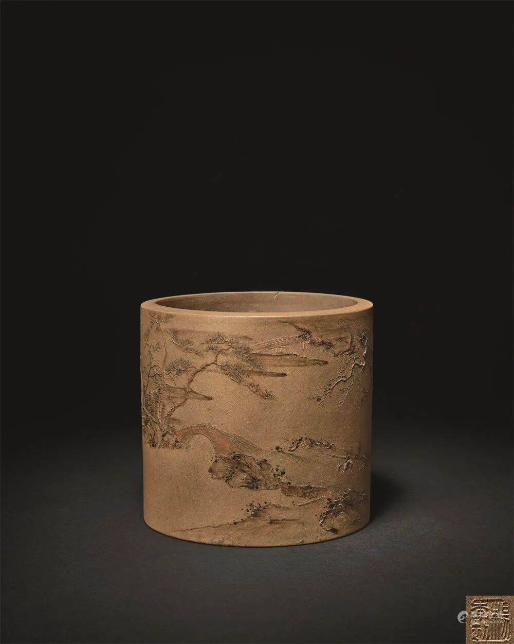 Lot 2248 清雍乾杨季初 秋山行旅彩色堆泥绘笔筒拍品估价:2,600,000 - 3,000,000 人民币款识说明:杨季初,宜兴人,清·唐仲冕《重刊荆溪县志》卷四(清光绪刻本)载:“杨季初,菱花壶甚工,与陈汉文同时”。另据嘉庆二年李先荣、宁楷的《嘉庆增修宜兴县旧志·艺术》陈汉文,雍正时人。乃知杨季初为雍正时宜兴陶工,惟目前所见杨季初作品均为彩泥堆绘,尚未见到砂壶之作。雍正国祚不长,杨氏的活动时期理应更久。查考北京故宫博物院藏品,三件口沿髹漆描金者断为雍正朝,均未署款,其余几件断为乾隆朝。由上可知紫砂器的泥绘之风本件杨季初堆绘秋山问道图笔筒是目前所见杨季初传世笔筒中的标准尺寸,泥绘画意亦是精妙绝伦。此笔筒采用段泥为胎,彩色泥绘并堆砌与外壁。玉璧式圈足,器底钤印“杨季初”篆书阳文款,印文为精细的元朱文。画意以《秋山行旅图》为题,立意闲逸悠远,观之赏心悦目。构图上以传统的“三远”为法,远山近树,苍翠重重,山溪潺潺。远处缓坡渐迭,近处嘉木葱郁。山野画意中,一人骑驴,一人着担,意趣横生,一派宁静清寂意趣。本笔筒用料考究、画工精湛,可谓是色堆泥绘作品中之传世佳作。北京故宫博物院的清宫旧藏中有色泥堆绘山水纹笔筒,当是杨季初入贡内廷御用的作品。南京博物院亦藏有杨季初制雪江待渡图笔筒,写尽寒冬萧瑟雪景。这件笔筒与故宫旧藏在形制上一致,设色上也极为近似,可能为同一批入贡皇宫御用的器物。