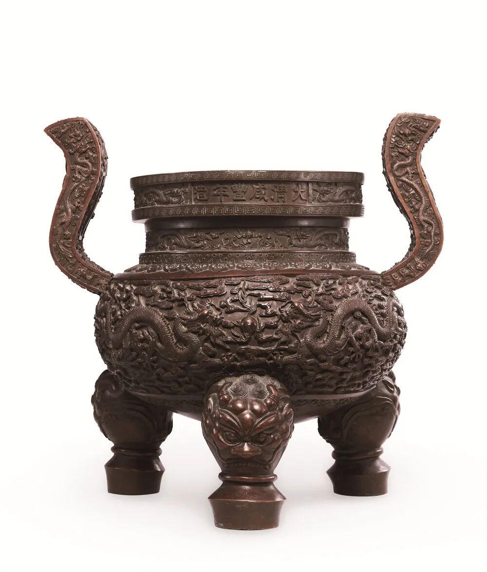 Lot 972 清 大清咸丰年造浮雕双龙戏珠朝冠耳炉拍品估价:1,500,000 - 1,800,000 人民币此件朝冠耳造型端庄大气,炉壁厚实。作盘口束颈,鼓腹浑圆,一双朝冠耳自炉肩而出,蜿蜒越过炉口,颇具雄浑之势,炉下承三枚兽面蹄足,承托炉身尤富力量感。此炉上下满施浮雕装饰,无一处留白,炉口、颈、腹部三周,皆饰双龙赶珠,并以回纹及覆莲相间隔;双耳内外皆满刻游龙为饰;腿足浮雕兽面。整器浮雕装饰颇为有致,尤其主体的云龙赶珠图案,设祥云铺地,双龙龙首及宝珠皆以高浮雕突出,繁而不杂,显为清宫造办处所出。此式朝冠耳炉,是清代宫廷最为典型的铜设之一,其多陈设于宫中佛堂正中及大殿殿前,属等级较高的铜设为佛前五供正中之铜炉,因而作此般高挑的朝冠耳形,尤具庄重不凡的庙堂气质。据本品之尺寸、工艺,其应为清皇室佛堂礼供所用的五供之一。