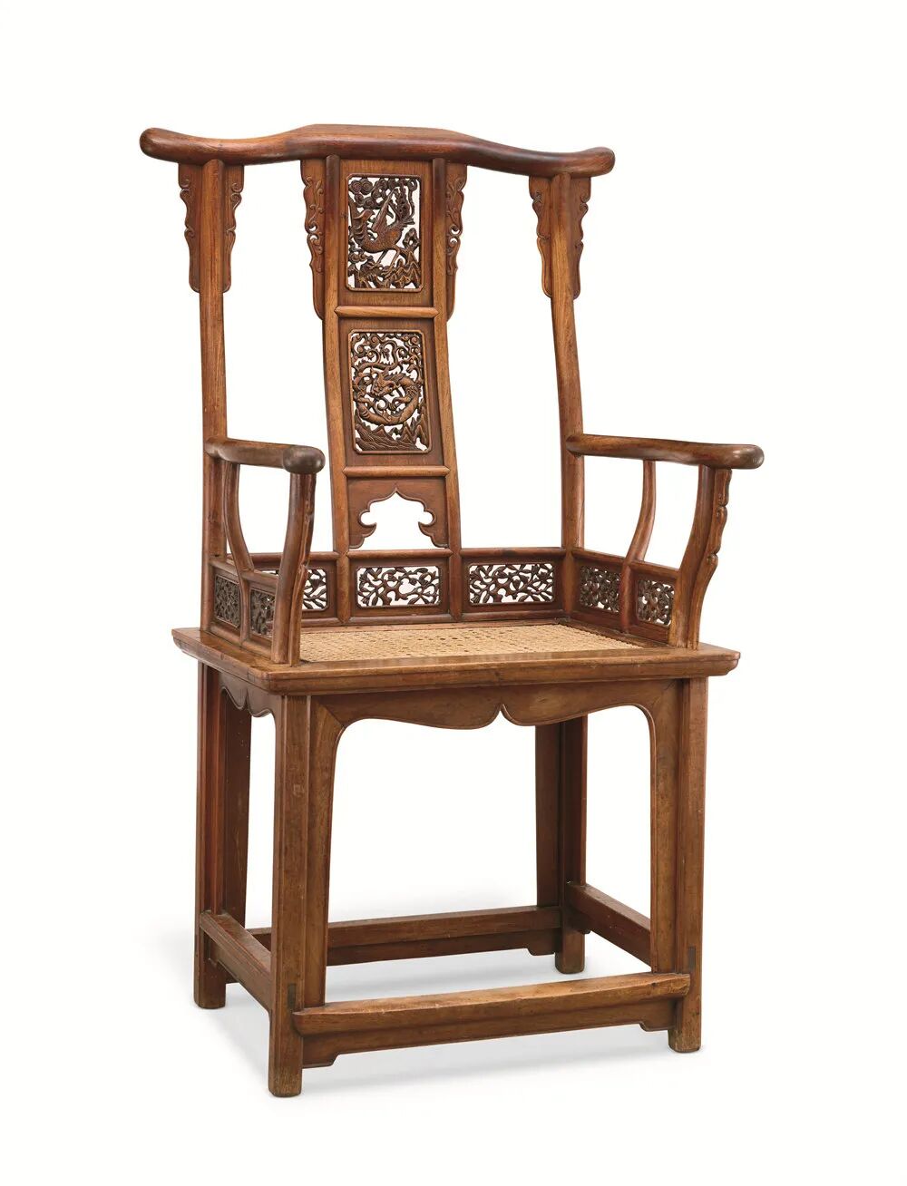 Lot 2933 明晚期 黄花梨鸣凤纹大四出头官帽椅尺寸:座宽 67.2cm;座深 51cm;高 130.5cm拍品估价:6,800,000 - 8,800,000 人民币此椅尺寸硕大,座面高耸,装饰秾华,非日用的座椅,度其用度,概有两种可能,一或为充宝座之用,以示坐者之庄严身份,则从其鸣凤纹来看,凤为君子之意,或是宫廷、王府等尊贵人员所用。二可充禅椅之用,则可上溯宋元,与禅宗宗师所坐大椅相类,是高僧说法或禅修时所坐。其造型奇特,与之大体相类者,可举两例,一为国家博物馆所藏彩漆缠枝牡丹纹四出头式宝座,另一位故宫博物院藏黄花梨螭龙纹带托泥圈椅,后者亦见有数例相近者,这些椅具的显着特征为均较繁华,座面上皆有三面设透雕花卉图案的绦环板,且腿足、靠背板上均有长牙条,仪式性和宗教性较明显。