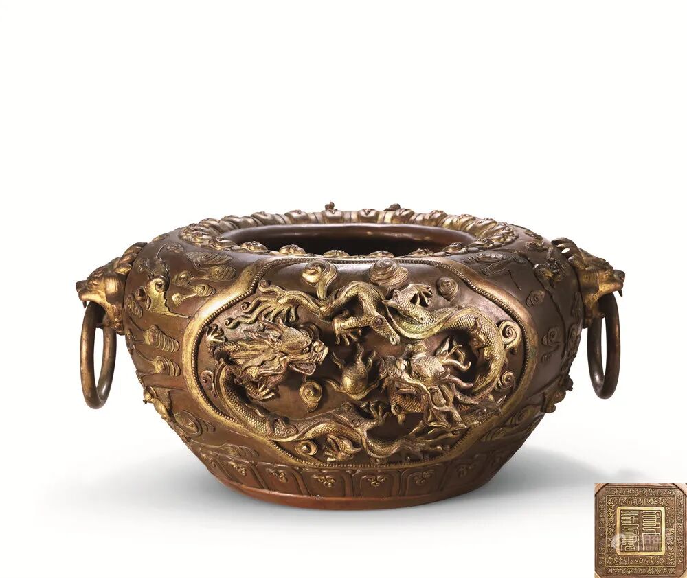 Lot 970 清乾隆 局部鎏金云蝠纹双龙戏珠铺首衔环钵式炉尺寸:口径 16cm;腹径 31.5cm;高 17cm拍品估价:3,500,000 - 4,500,000 人民币此炉形为钵式,造型丰满圆润,口沿内敛,丰肩圆鼓,渐下渐收,设铺首衔环双耳。整器造型尤似康熙朝创制的瓷器名品苹果尊,于铜炉中颇显别致。炉身满施浮雕装饰,口沿、底足环饰莲瓣纹,外壁两侧各饰一处如意形连珠开光,内高浮雕双龙戏珠,外浮雕云蝠为饰。炉内膛铸一十字杵图案,外底正中浮雕『皇帝行宝』满文篆印,四周环绕汉、藏双语诗文,为康熙帝御制诗《法海寺瞻皇考御书敬佛二字》,诗云:重来瞻御笔,怀感动心神。丕烈迈前代,鸿休启后人。兴文盛礼乐,偃武息兵民。法则光华远,千年照佛轮。此炉所用高浮雕技法尤显高超,在清宫铜雕之中,难寻与本品相及者。其浮雕凸起处皆用鎏金,开光内双龙戏珠更是近乎于圆雕,双龙舞爪环游之态展现淋漓,似欲夺画而出,自生威势。整器外壁、内膛、炉底,无一处光素之处,尤显华丽可赏,且下方落款署清宫宝玺印文,显然为宫廷御制之物。