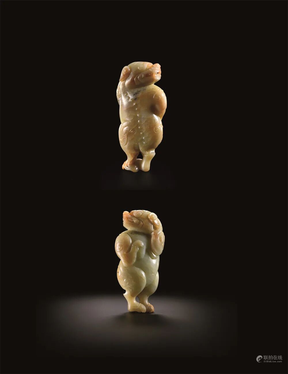 拍品估价:900,000 - 1,200,000 人民币来源:罗伯特·杨门(Robert P. Youngman)旧藏出版:《杨门藏玉:中国玉器.新石器时代至清代》,图版78号。此玉熊取材青玉,玉温润而多沁。整器以圆雕、浮雕、线刻等多种手法结合,雕出熊之圆浑健壮、肉丰骨劲的形态。玉熊两只眼睛炯炯有神,口微张,一手搭头,做瘙痒状,神态逼真传神。盘玩既久,器表包浆莹润,光泽熠熠。