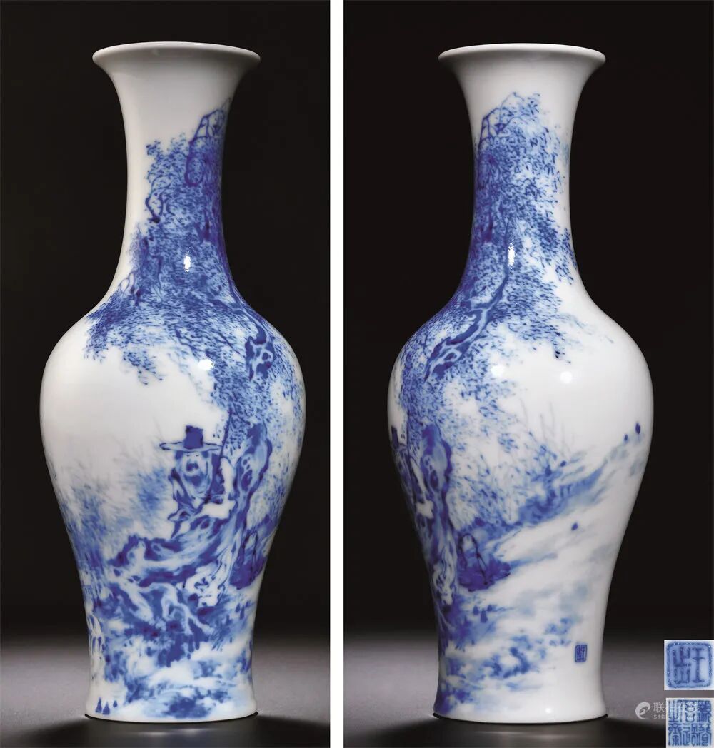 拍品估价:8,000,000 - 10,000,000 人民币作者简介:王步(1898-1968),字仁元,号竹溪,江西丰城县人。中国陶瓷美术大师,陶瓷美术家。王步在景德镇从事陶瓷美术工作长达六十多年,所创作的各类瓷器作品数以万计。王步的艺术创新和取得的成就,使他成为中国陶瓷发展史上的里程碑式人物,对新中国陶瓷的发展产生了巨大的影响。他的作品得到普遍的喜爱,被国内外博物馆、收藏家所珍藏,并在国内外书刊上广为发表,成为千古经典。此观音瓶器形窈窕俊美,外壁以青花绘就《渊明东篱采菊》图。一株古柳虬然傲立,枝干遒曲盘错,沧桑峥嵘,柳叶繁密飘逸,似有风来,以柳树枝叶的倾斜代表风势,这就化无形为有形了,体现了作者的高超画意。此处所绘的古柳,似是信手拈来,先生当胸中自有丘壑,莫不是暗含了渊明先生的别号“五柳先生”?画中陶公手执长杆,头戴竹笠,斜倚树干,一篮秋菊正含苞怒放。人物脸部描绘或用点,或用线,毛发胡须处密不透风,眼睛及鼻子着墨颇少,形成强烈的对比,把先生不为五斗米折腰的士人精神演绎得恰到好处,观之令人肃然起敬,这就是渊明,这就是千古经典,这就是我们民族的精神,其精神之光,可为明烛,照耀千古。