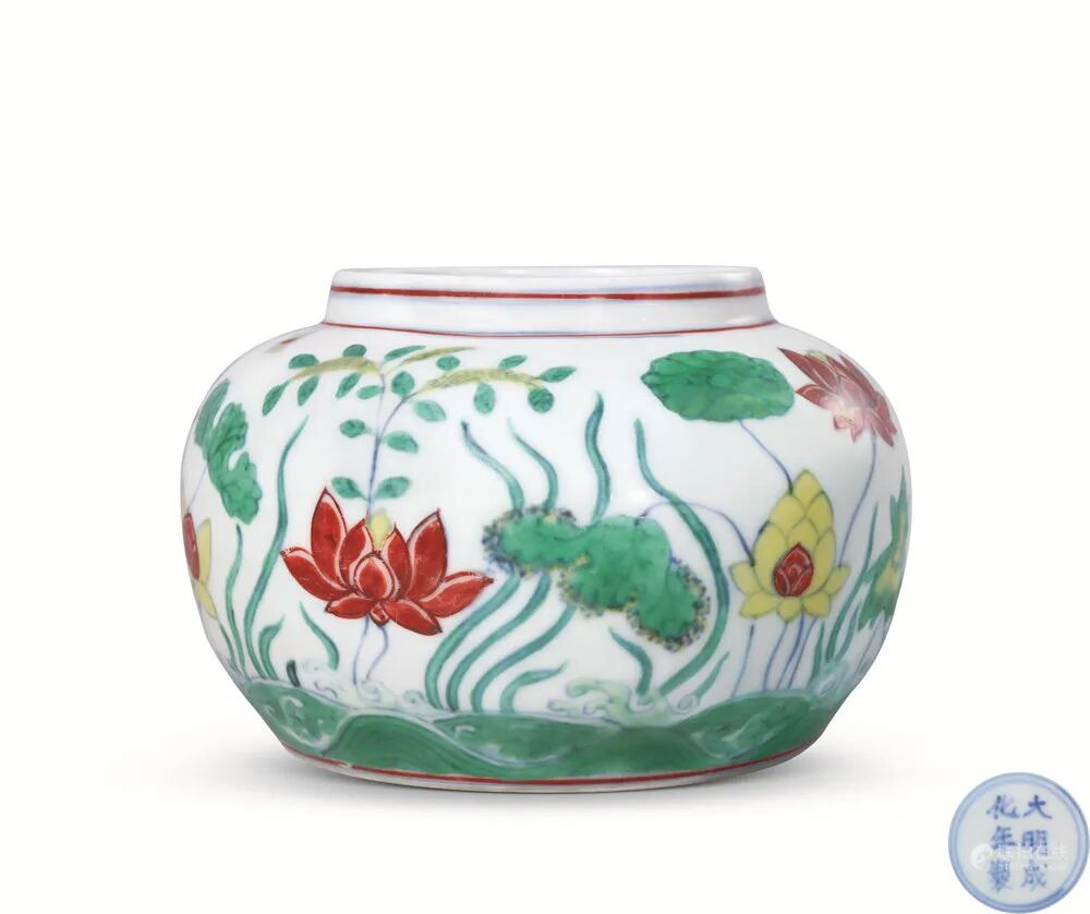 此罐形体秀美,胎质洁白细腻,厚薄均匀,色彩丰富,以填彩为主,点彩为辅,纹饰描画工整。此种成化斗彩罐除了画折枝莲纹外,还见有画菊蝶纹、宝相花纹者。明成化斗彩的造型皆小巧,无大器。从现有故宫博物院的藏品看,罐类藏品最高的仅高19厘米,中形罐一般高8—19厘米。无论何种器,其器形都具有圆润端庄、清雅隽秀的特色。