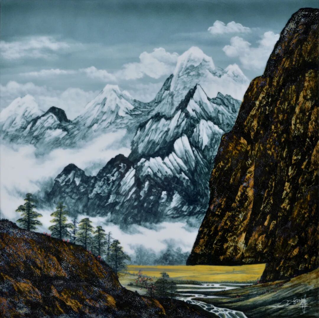 彭建春室名“春晖斋,擅长以花鸟、青绿山水兼人物走兽等以中国画为主的陶瓷彩绘艺术,尤攻釉上粉彩。