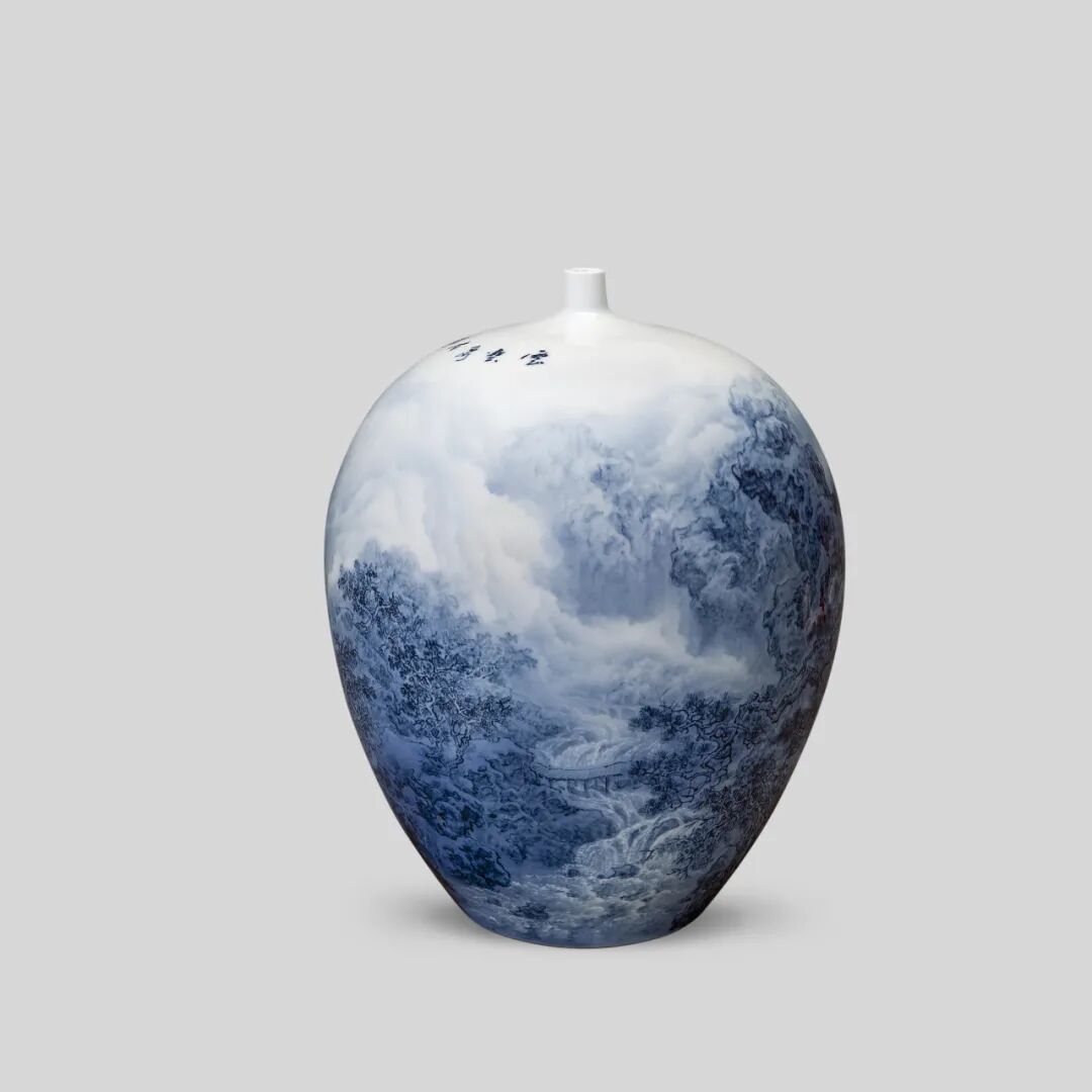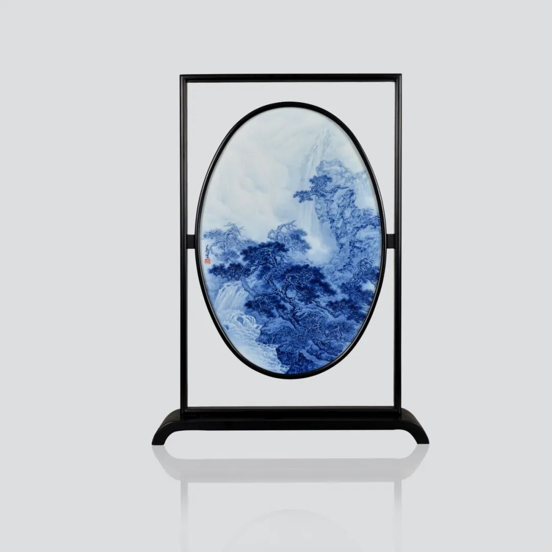 作者以青花工艺绘制瓷板画《登高观云》,构图精巧,留白分寸恰到好处,让整个画面显得错落有致。