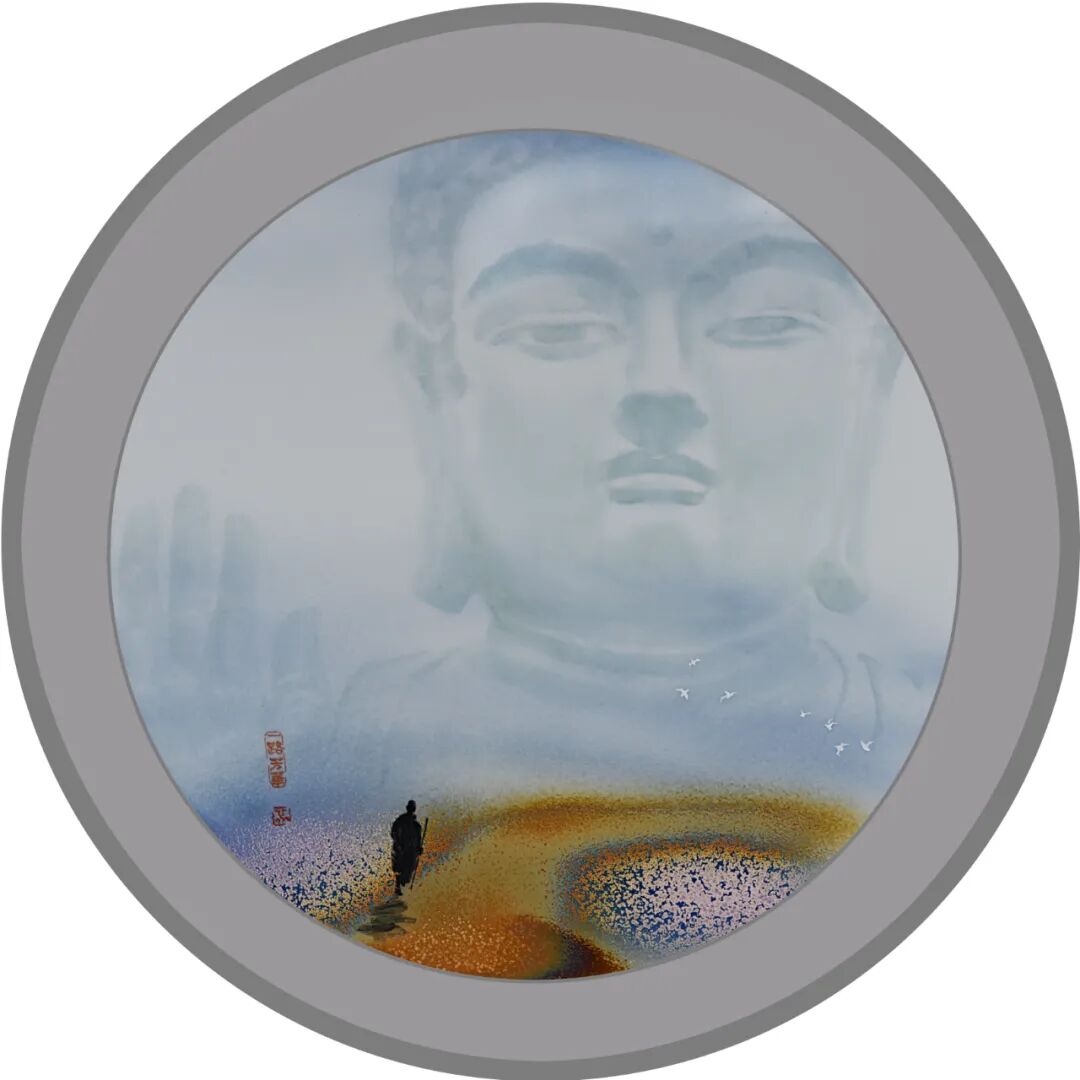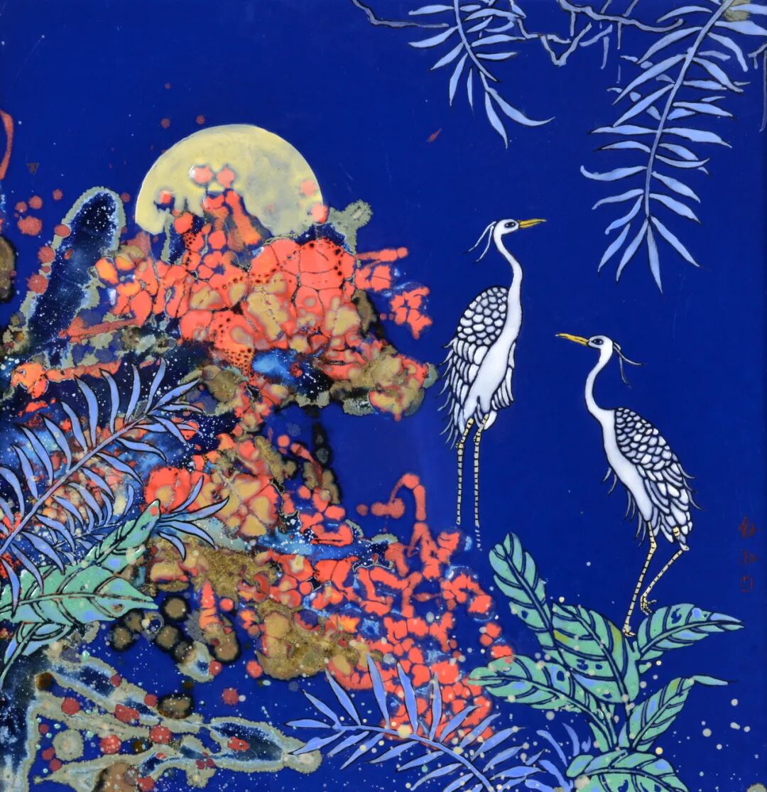 作者以釉上釉下结合绘制的瓷板《涅槃》,经两次烧成,构图明快、用色大胆。