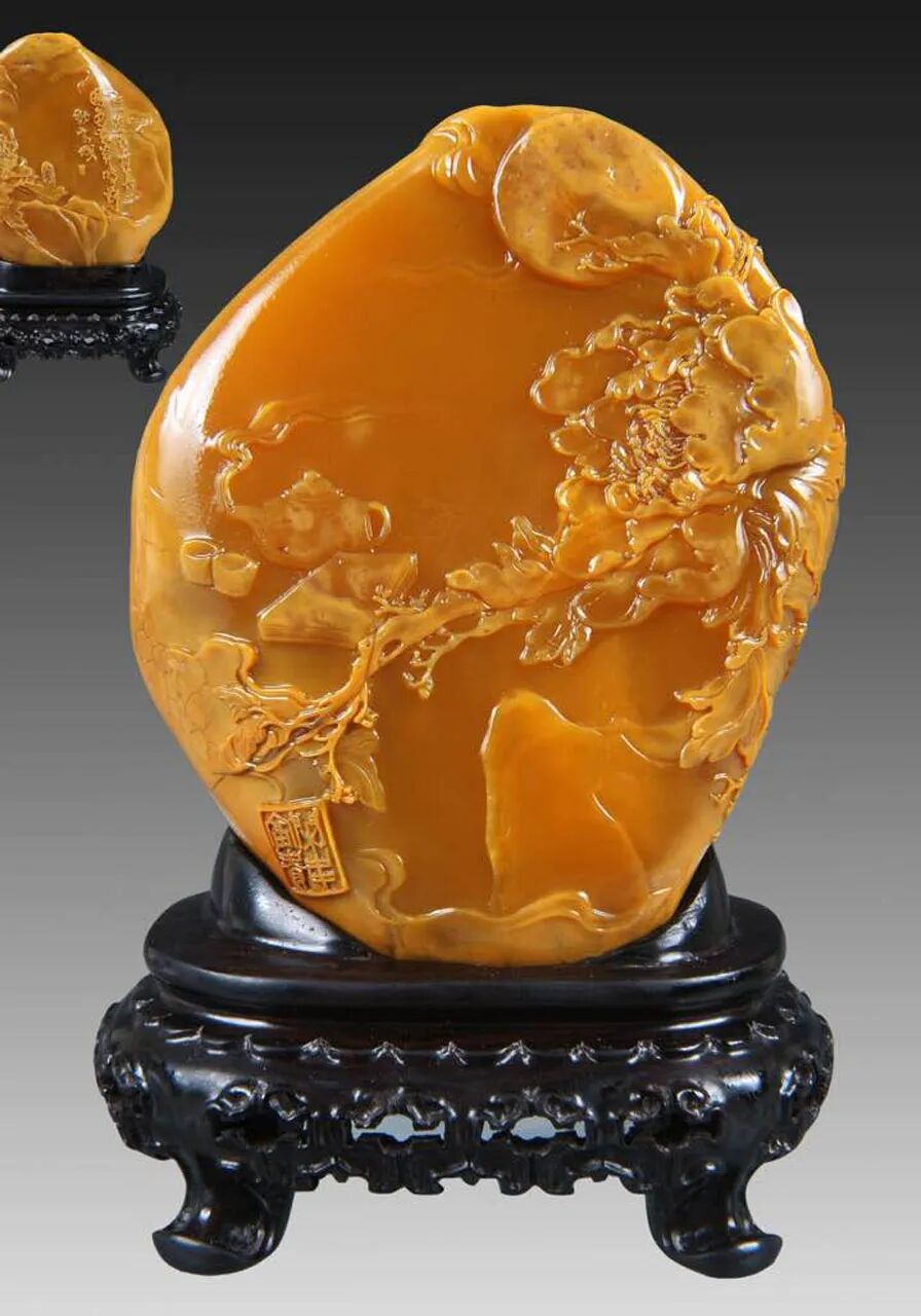 寿山石,有"石帝""石后"之称,彩石具有"细、结、润、腻、温、凝"之六德,其石质、石色、石形,石纹丰富多彩,晶莹滋润,储藏品种丰富,硬度为摩尔 2.5 - 2.7 之间,是上等雕刻彩石,有"贵石而贱玉"之说。