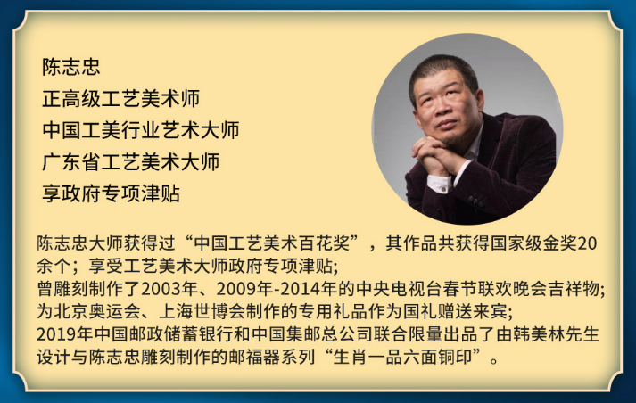 我国传统技艺金属錾刻非遗传承人。2003年、2009-2014年央视春晚吉祥物、北京奥运会和上海世博会指定国宾礼品,都出自陈大师之手!