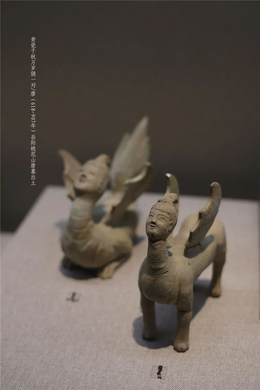 岳阳桃花山唐墓出土的这对青瓷千秋万岁俑真的令人印象深刻,奇特的造型特别抓人眼球[哇],它的形象特别贴近于《山海经》中出现的怪物——禺强。人的面部、鸟的双膀以及像马一样的身体组合起来,给人很强烈的视觉冲击力,这种形象引人思考,古人当时的想法是什么,为什么做出这么光怪陆离的陶俑。