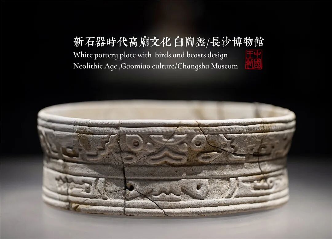 此白陶盘是高庙文化出土的器型最完整,纹饰最精美的一件,利用阴纹阳纹的组合表现出了鸟兽形象的浅浮雕效果,白陶的纹饰,显然不是简单的装饰艺术,而应该是具有象征的意义,其所传达的应该是信仰和情怀。白陶是史前湖南的一大创造,它产生于远离江湖平原的河谷山川,那里充满了神秘的色彩和浪漫情调,白陶隐于深山又大白于天下,对中华史前文化所产生的影响不可低估。