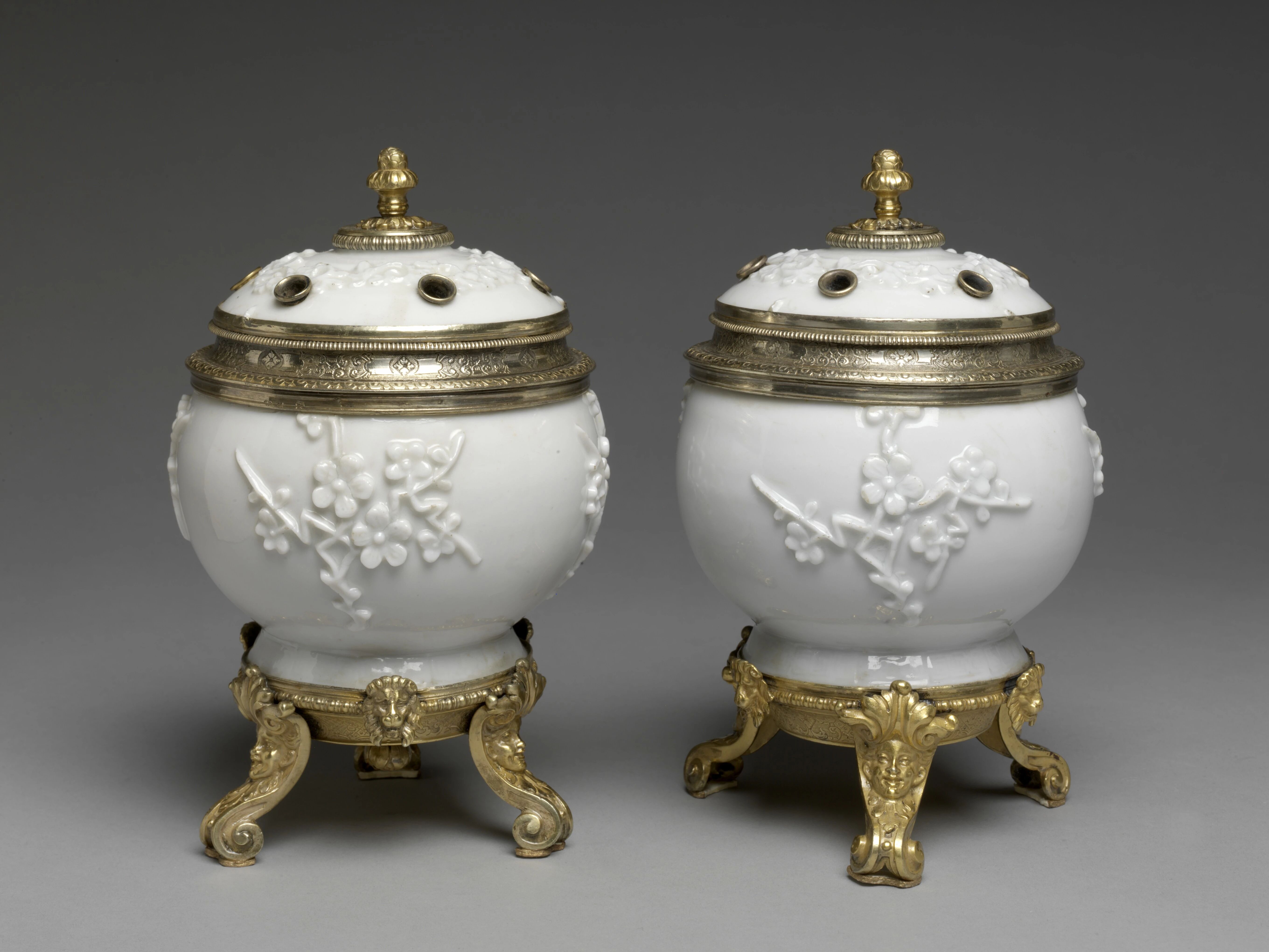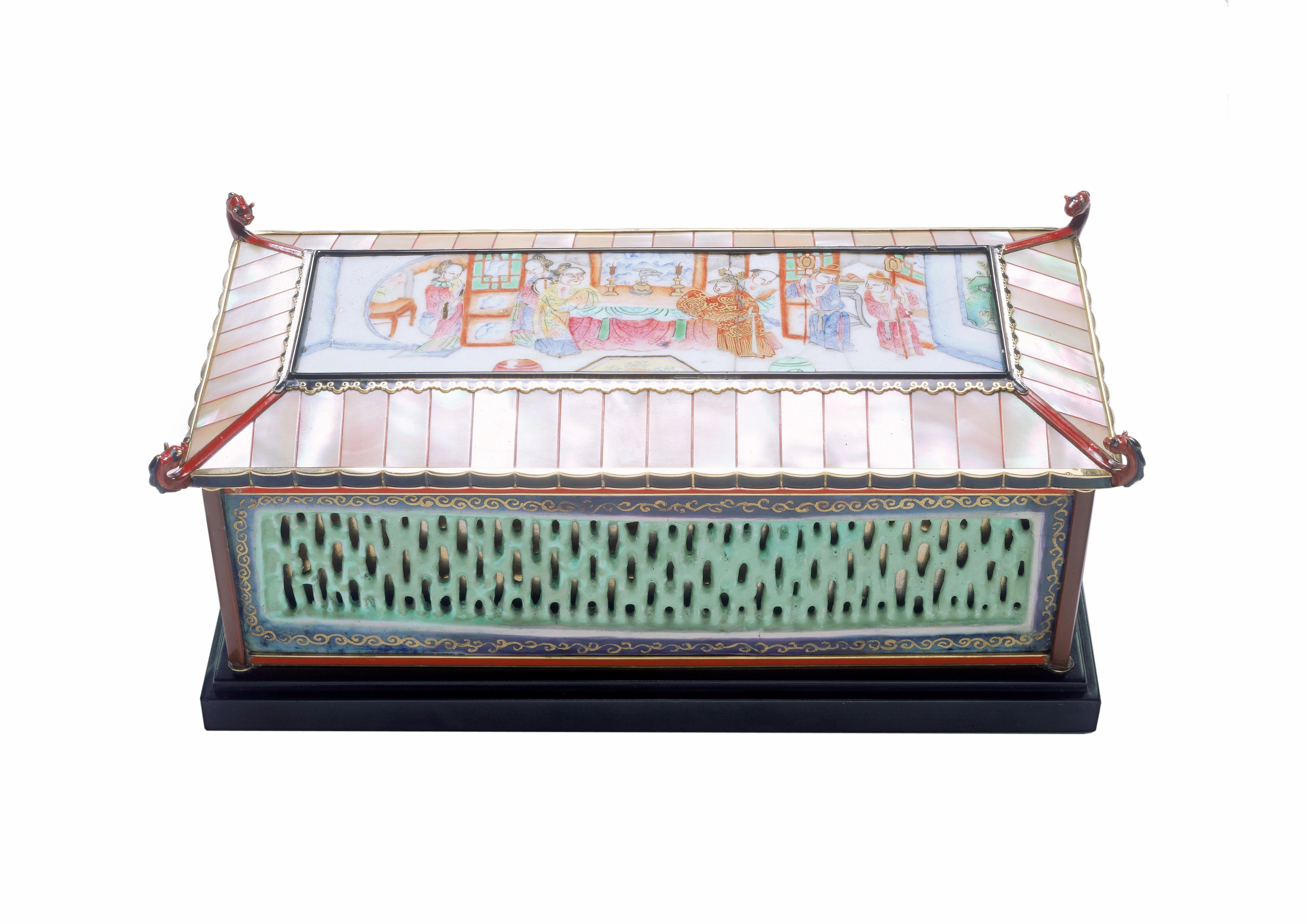 此例中,瓷制香笼被拆分成多个部件,与金银、珐琅、硬橡胶、珍珠母贝等材质及其他瓷器的部件组装成一座中式建筑。这种切割、改装的思路在维多利亚与艾尔伯特博物馆收藏的白釉梅花纹瓶改装香熏上已见端倪,香熏器身截取自长颈瓶,器盖则原为碗盖,镶嵌鎏金银。