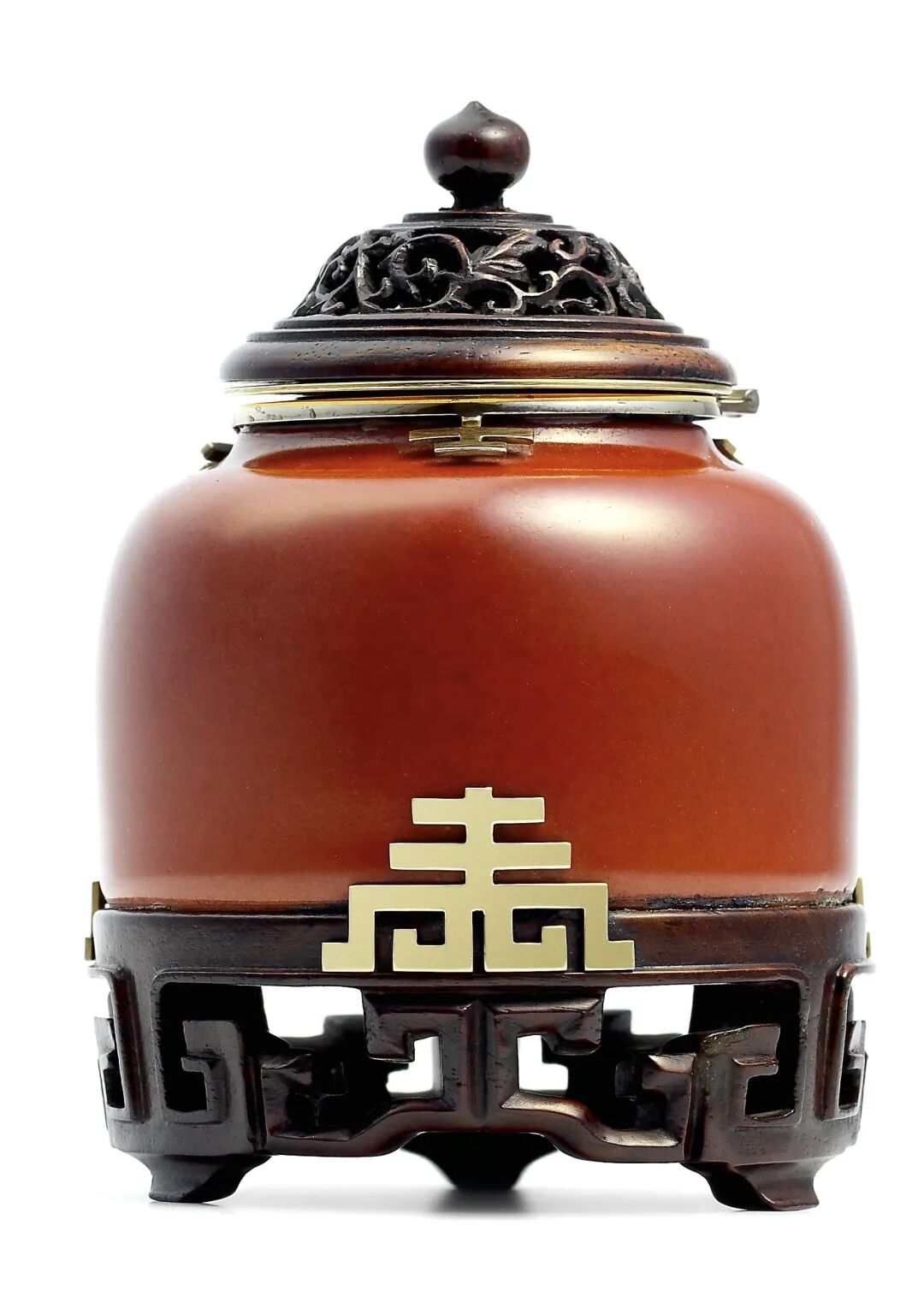 烧制于雍正年间的瓷制水盂保持着完整性,水盂口沿处加装金制包边、开合轴和托,以连接镂空木雕钮盖;下承以木雕底座。水盂一周围绕四组金制寿字装饰,每组寿字上与口沿相连,下连底座,并与木雕合为团寿形式,与作为主体的瓷器形成和谐的搭配,金、红、黑的色彩组合庄重典雅。