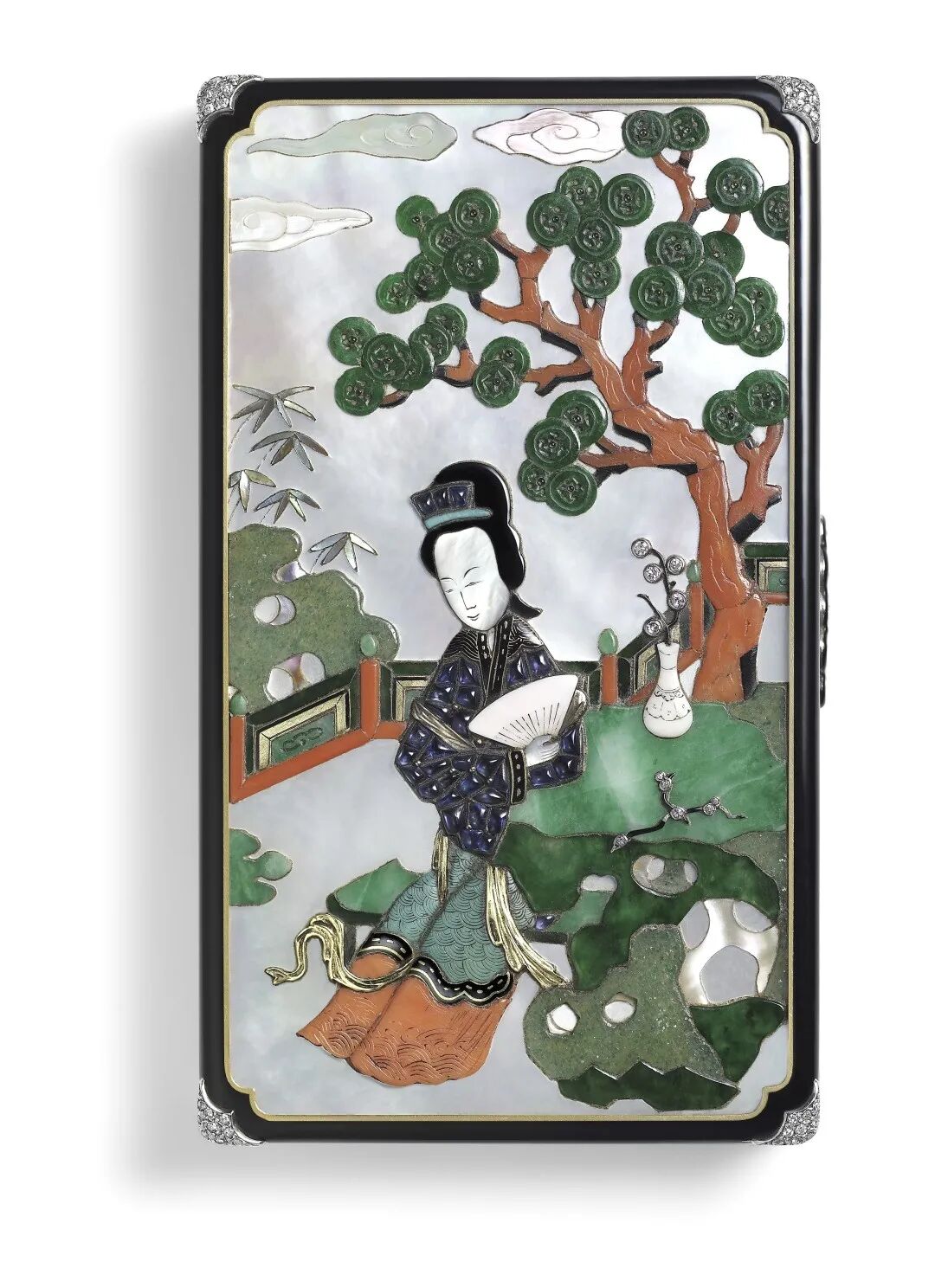 如果扩展到瓷器之外,18世纪法国奢侈品商人从东方家具上拆下漆板重新组装,也是类似的做法。卡地亚在这一时期收藏各式各样从珠宝、器物拆解出的局部作为“素材”储备,常将波斯、印度、中国、埃及等各地古物如此拆分重组,以独特的创意撷取、调和异域文明的残片,使作品符合当下的审美与需求。改装而成的烟盒既保留中国传统的风貌,又具有摩登风范,不仅融合了东方与西方,也将古典与现代融为一体。