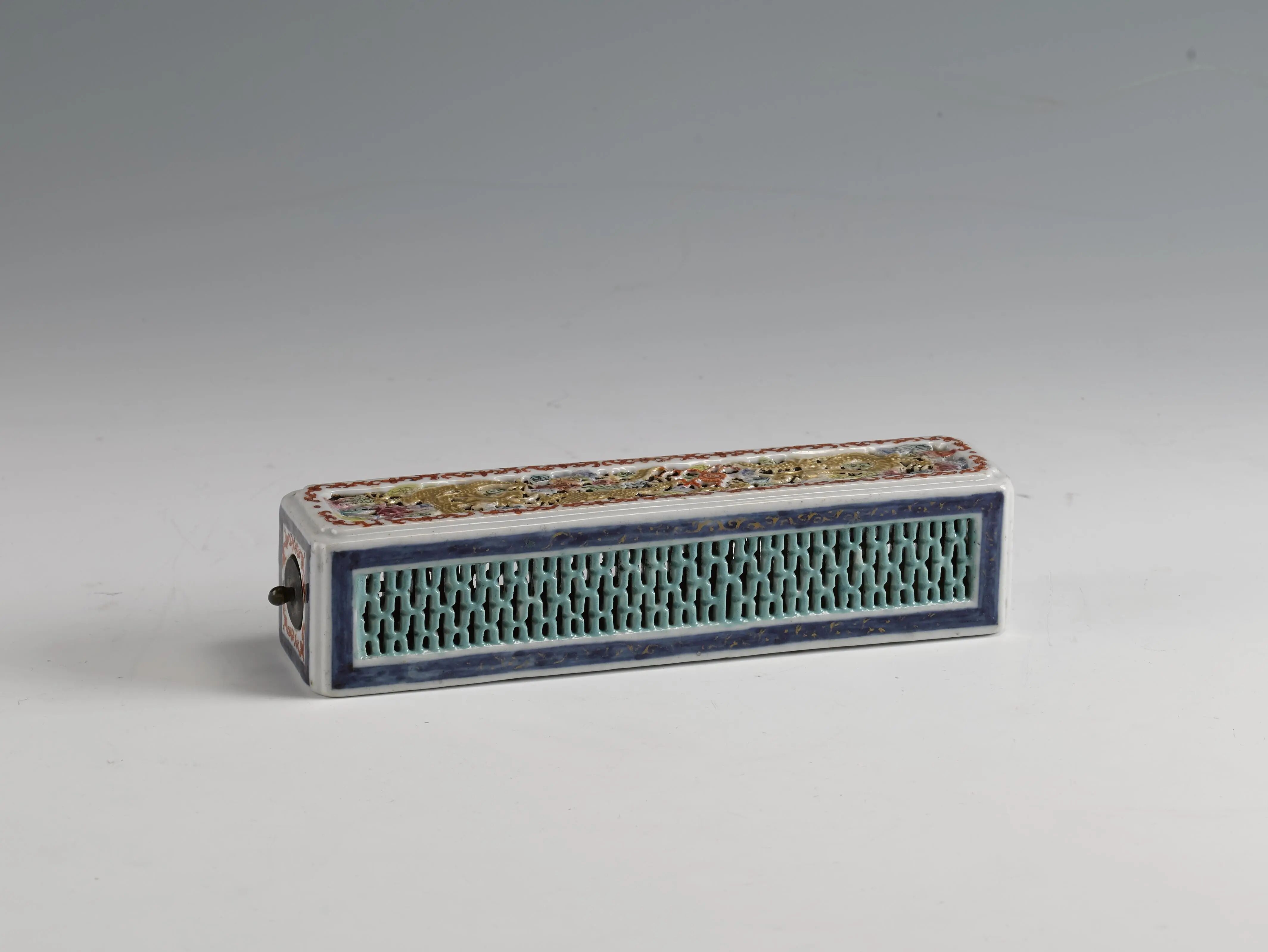 第二件器物是粉彩人物镂空长方香笼改装台式烟盒。