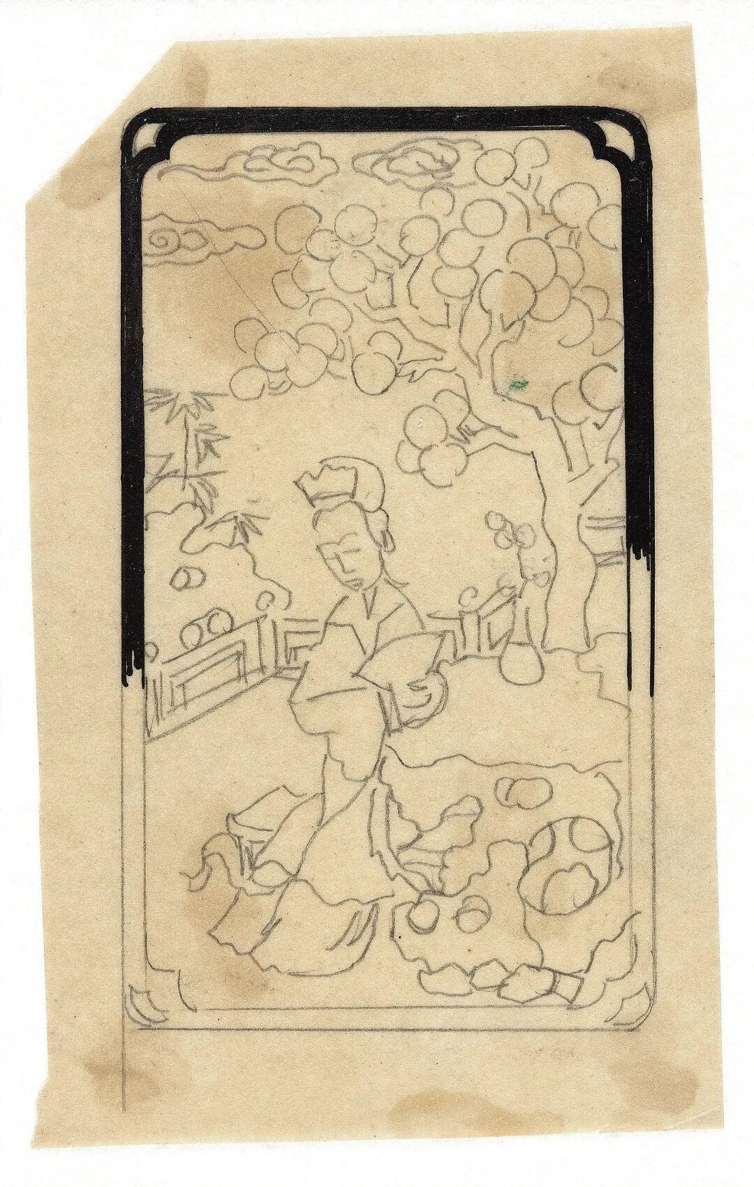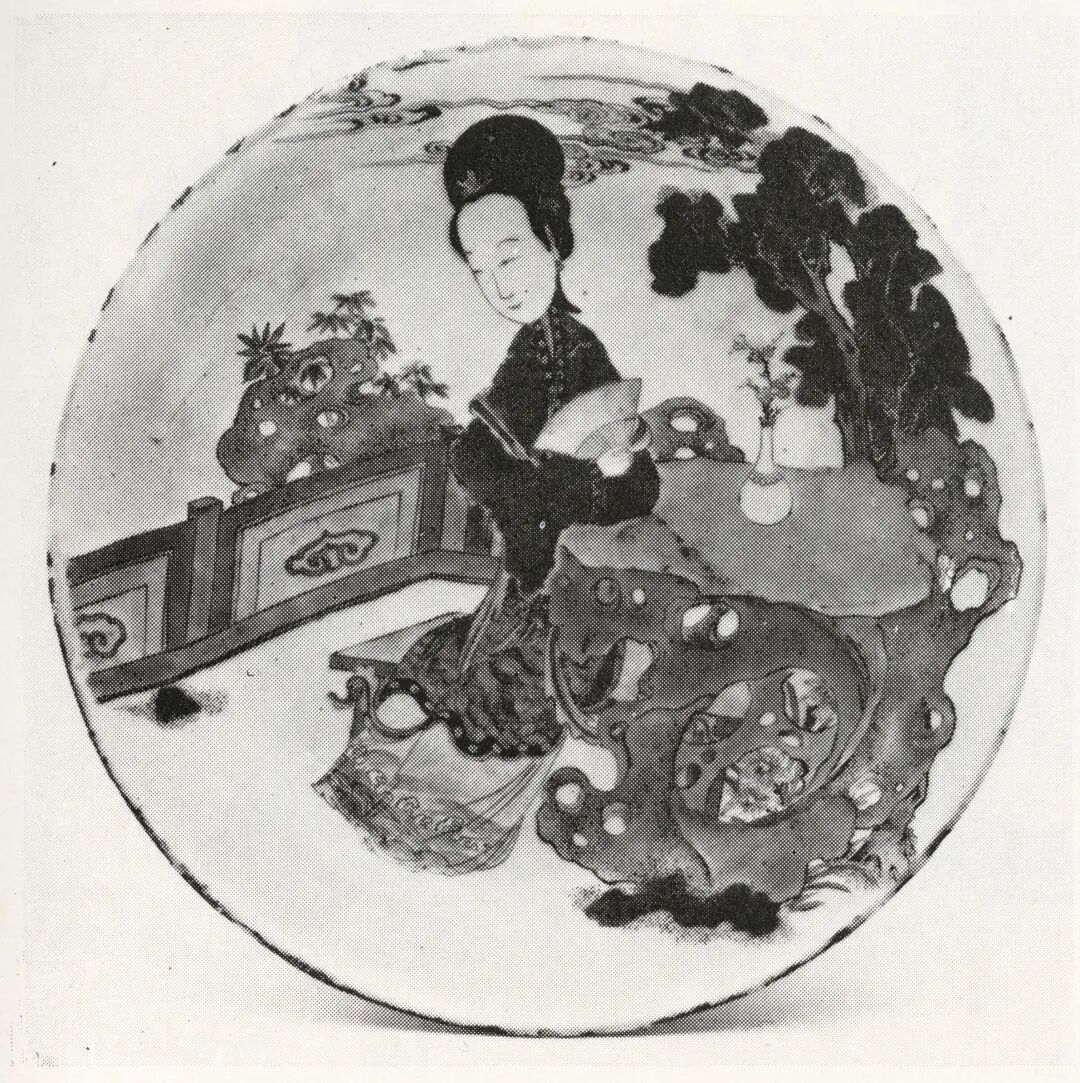 有趣的是,从画稿和记录看,盒盖嵌片图样正来自路易·卡地亚私人收藏的一件康熙五彩瓷盘。化妆盒的设计者将圆形瓷盘的图样略加调整,以适应盒盖的长方形构图。